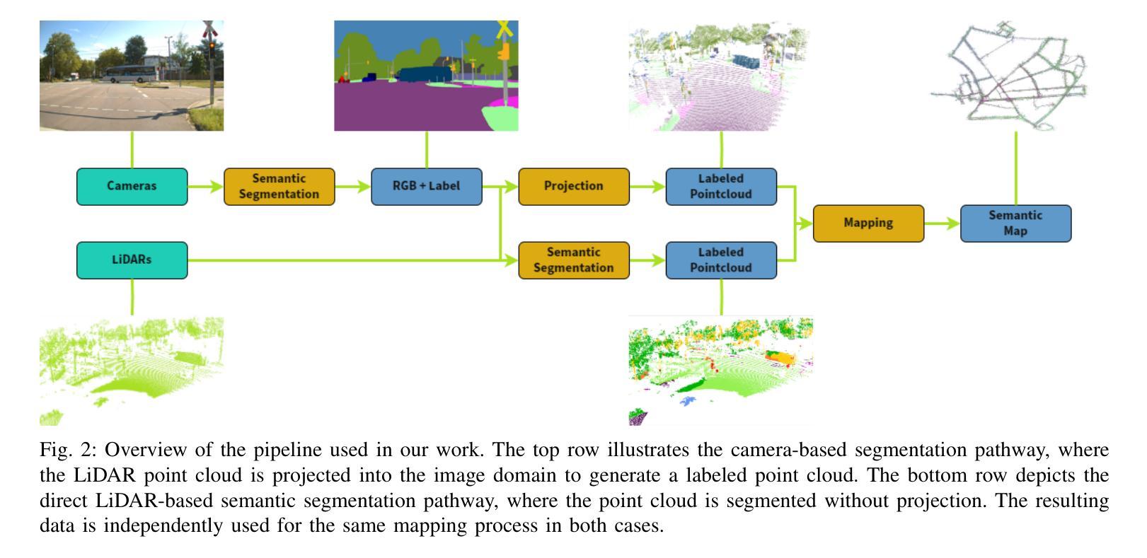 激光雷达数据的语义分割存在相当大的挑战,特别是在处理多种传感器类型和配置时。然而,融入语义信息可以显著提高基于激光雷达的自主移动系统定位技术的准确性和稳健性。我们提出了一种将语义相机数据与激光雷达分割相结合的方法,以应对这一挑战。通过将激光雷达点投影到相机的语义分割空间,我们的方法提高了基于激光雷达的定位流程的精度和可靠性。