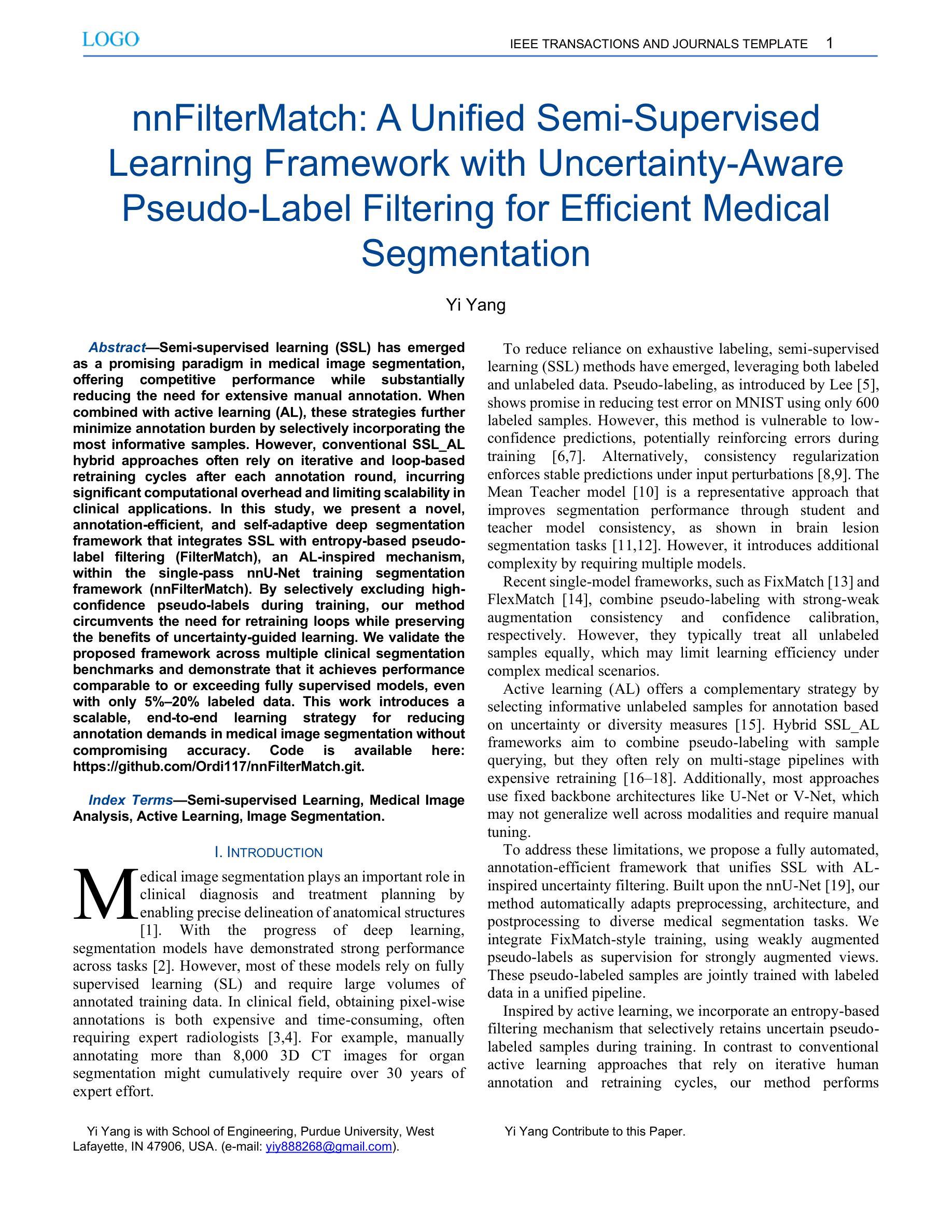 半监督学习(SSL)结合主动学习(AL)在医学图像分割中展现出巨大潜力,能够减少大量手动标注的需求,并提供竞争力强的性能。然而,传统的SSL_AL混合方法常常依赖于迭代和循环再训练,这增加了计算负担并限制了其在临床应用中的可扩展性。本研究提出了一种新型、标注高效、自适应深度分割框架,该框架将SSL与基于��ndropy的伪标签过滤机制(FilterMatch)相结合,在单次通过nnU-Net训练分割框架(nnFilterMatch)内实现。通过选择性排除高置信度的伪标签进行训练,该方法避免了再训练循环的需要,同时保留了不确定性引导学习的优点。我们在多个临床分割基准测试中验证了所提框架,并证明即使只有5%~20%的数据被标注,其性能也能与或超过全监督模型。本研究为医学图像分割领域提供了一种可扩展的端到端学习策略,能够在不牺牲精度的情况下减少标注需求。相关代码可通过链接访问:https://github.com/Ordi117/nnFilterMatch.git。