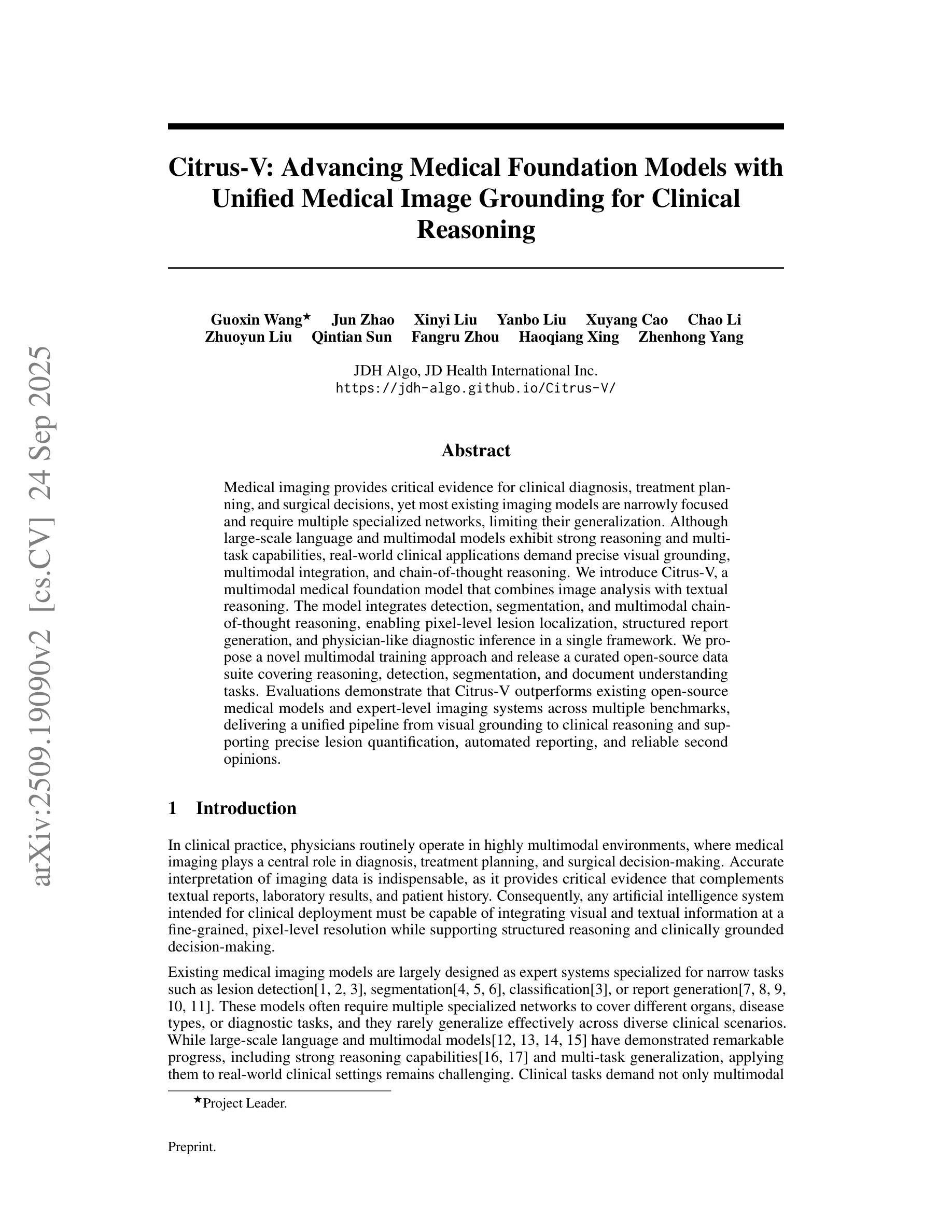 本文介绍了Citrus-V这一多模态医学基础模型,该模型结合了图像分析与文本推理,实现了像素级病变定位、结构化报告生成和医生级别的诊断推断。它采用了一种新颖的多模态训练方法,并发布了一套涵盖推理、检测、分割和文档理解任务的开源数据集。评估表明,Citrus-V在多基准测试中优于现有开源医学模型和专家级成像系统,为从视觉定位到临床推理提供了一个统一的管道,并支持精确病变量化、自动化报告和可靠二次意见。