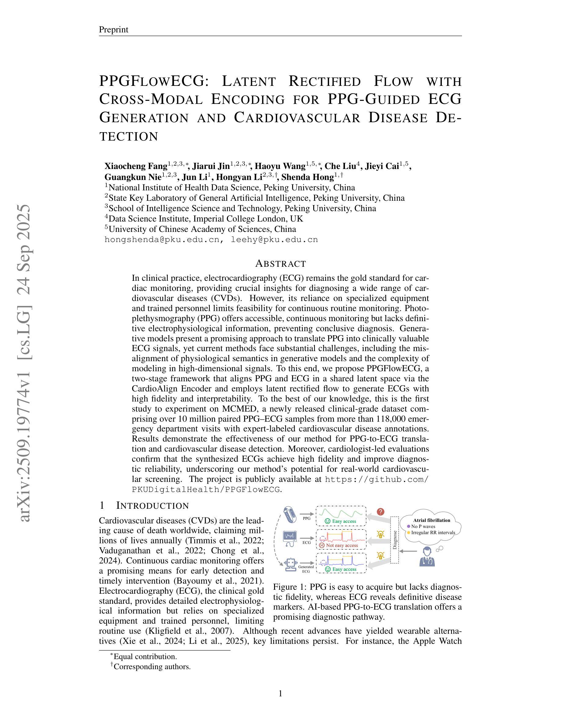 在临床实践中,心电图(ECG)仍然是心脏监测的金标准,为诊断各种心血管疾病(CVD)提供关键见解。然而,它对专业设备和受过训练的人员的依赖限制了其进行持续常规监测的可行性。光电容积脉搏波描记法(PPG)提供了可访问的连续监测,但缺乏明确的电生理信息,无法作出确切诊断。生成模型作为一种有前景的方法,可将PPG转化为具有临床价值的心电图信号,但当前方法面临重大挑战,包括生成模型中的生理语义不匹配和高维信号建模的复杂性。为此,我们提出了PPGFlowECG,这是一个两阶段的框架,通过CardioAlign编码器在共享潜在空间中对PPG和ECG进行对齐,并使用潜在整流流生成具有高保真度和可解释性的ECG。据我们所知,这是第一项在新发布的临床级数据集MCMED上进行实验的研究,该数据集包含超过1000万对PPG-ECG样本,来自超过11.8万次急诊就诊记录,并附有专家标注的心血管疾病注释。结果表明,我们的方法在PPG到ECG的翻译和心血管疾病检测方面非常有效。此外,由心脏病学家领导的评价证实,合成的ECG具有高保真度,提高了诊断的可靠性,这突显了我们方法在现实世界心血管筛查中的潜力。