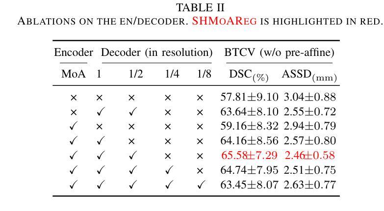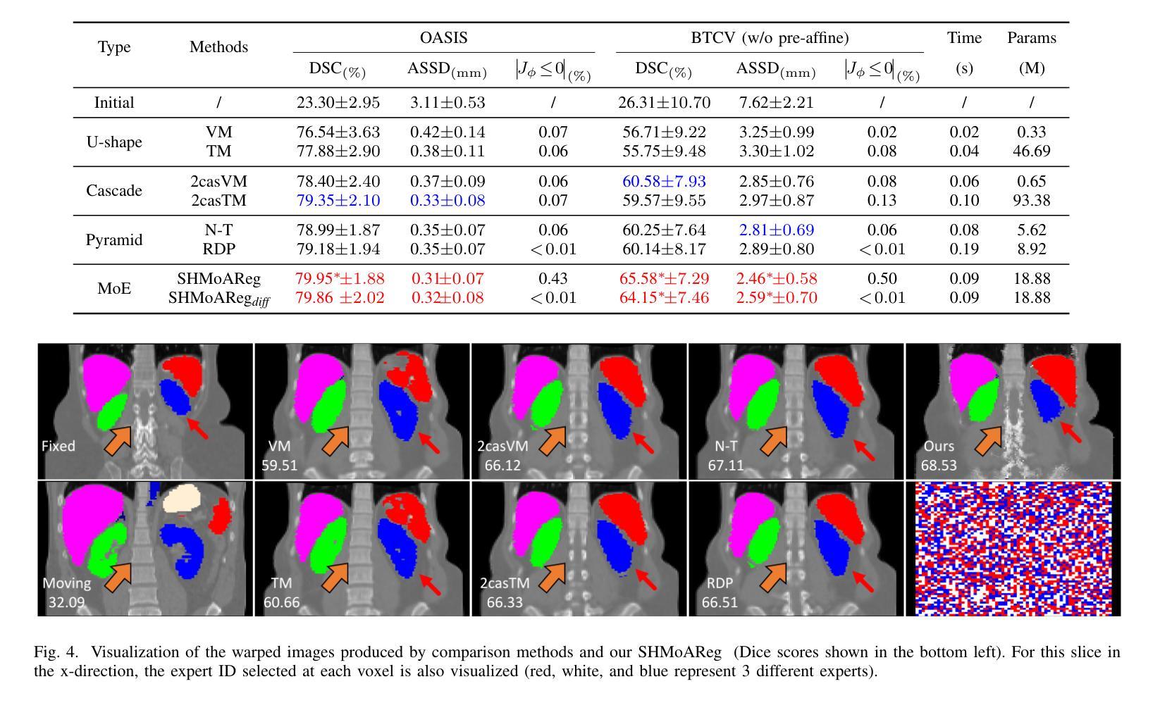 - 在公开数据集上的实验结果显示SHMoAReg优于其他方法,特别是在腹部CT数据集上Dice得分显著提高。