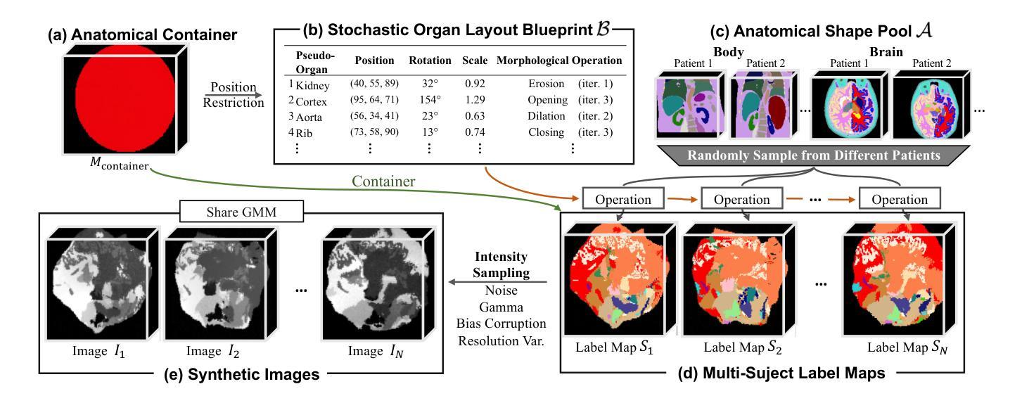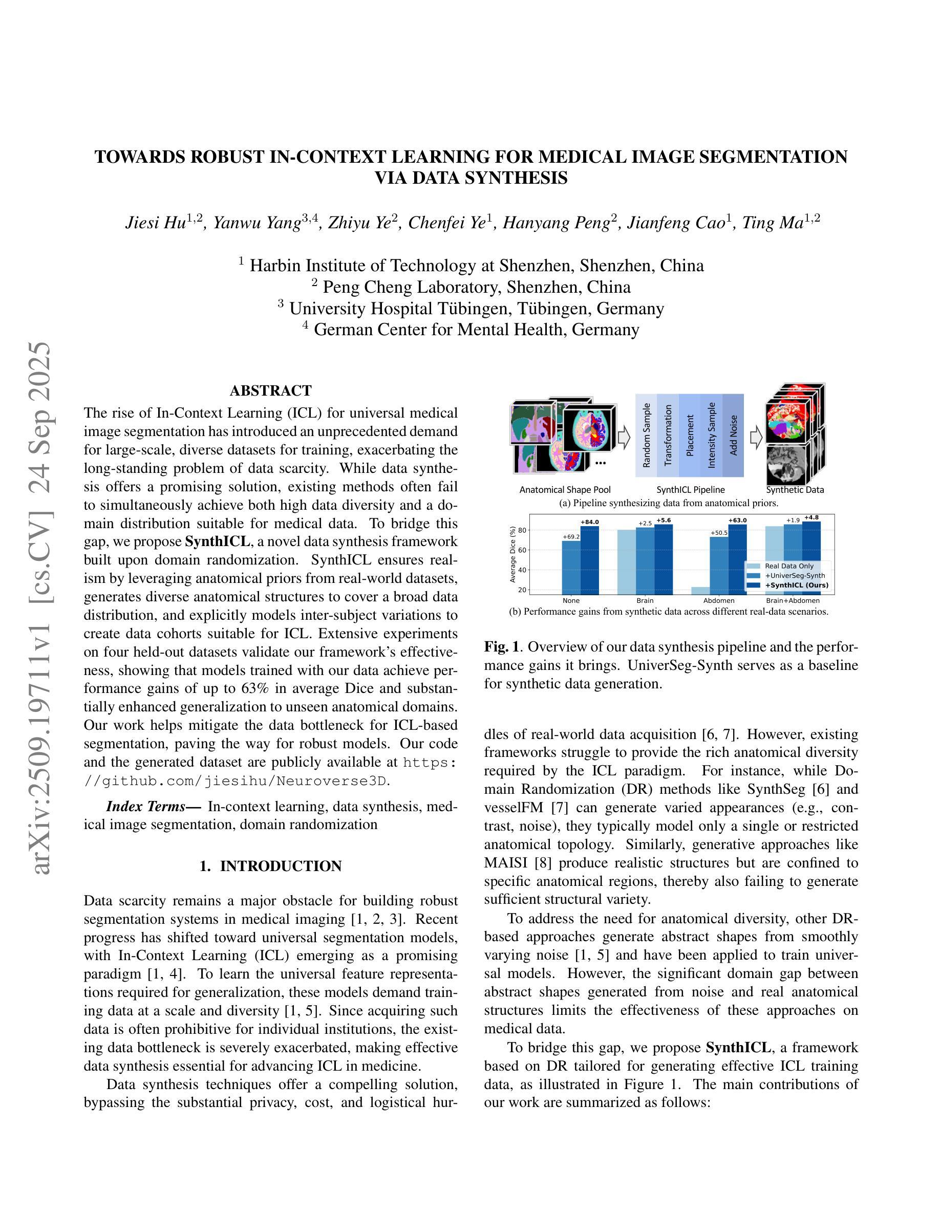 医学图像分割中上下文学习(ICL)的兴起对大尺度、多样化数据集的需求急剧增加,加剧了长期存在的数据稀缺问题。尽管数据合成提供了有希望的解决方案,但现有方法往往难以同时实现数据多样性和适合医学数据的领域分布。为此,我们提出了基于领域随机化的新型数据合成框架SynthICL。它通过利用真实数据集的人体解剖先验知识确保真实性,生成多样化的人体解剖结构以覆盖广泛的数据分布,并显式地模拟主体间变化以创建适合ICL的数据群体。在四个独立数据集上的大量实验验证了我们框架的有效性,表明使用我们的数据进行训练模型平均Dice提升高达63%,并在未见过的解剖领域实现显著增强的一般化。我们的工作有助于缓解基于ICL的分割中的数据瓶颈问题,为稳健模型的发展铺平道路。