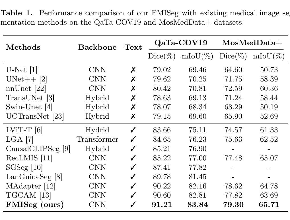 - FMISeg模型在QaTa-COV19和MosMedData+数据集上的实验表现优于现有方法。