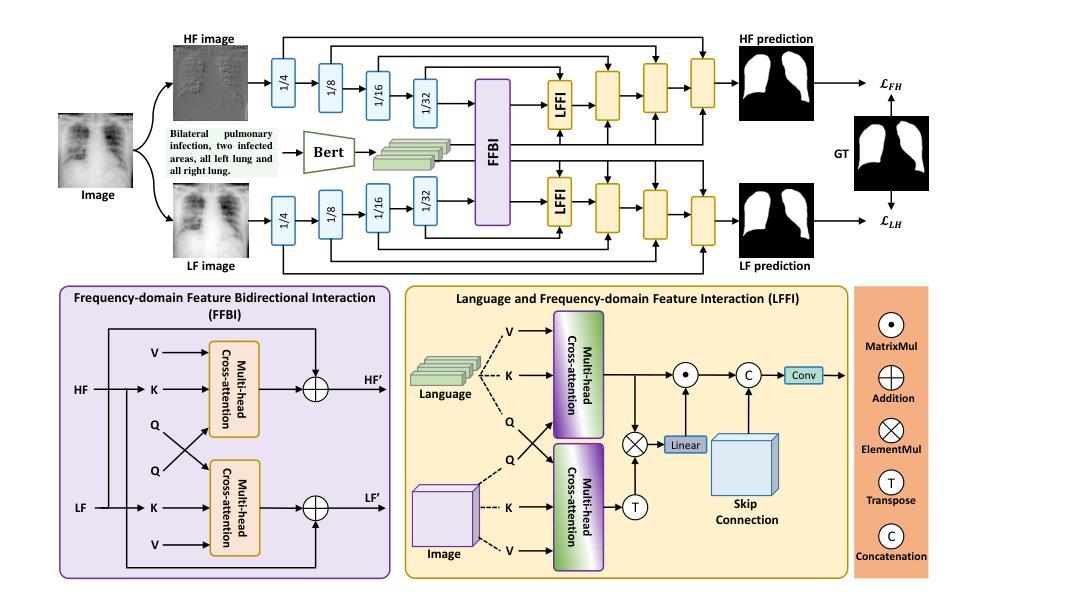 对放射图像中的感染区域进行自动分割是诊断肺部感染性疾病的关键。近期研究表明,通过融入临床文本报告作为语义指导,可以提高医学图像分割的准确性。然而,病灶的复杂形态变化以及视觉语言模态之间固有的语义鸿沟,使得现有方法无法有效地增强视觉特征的表示并消除语义上无关的信息,最终导致分割性能不佳。为了解决这些问题,我们提出了一种语言引导医学图像分割的频域多模态交互模型(FMISeg)。FMISeg是一种后期融合模型,在解码器中建立语言特征与频域视觉特征之间的互动。具体来说,为了增强视觉表示,我们的方法引入了一个频域特征双向交互(FFBI)模块,以有效地融合频域特征。此外,解码器中还融入了一个语言引导频域特征交互(LFFI)模块,在语言的指导下抑制语义上无关的视觉特征。在QaTa-COV19和MosMedData+上的实验表明,我们的方法在定性和定量上均优于现有方法。