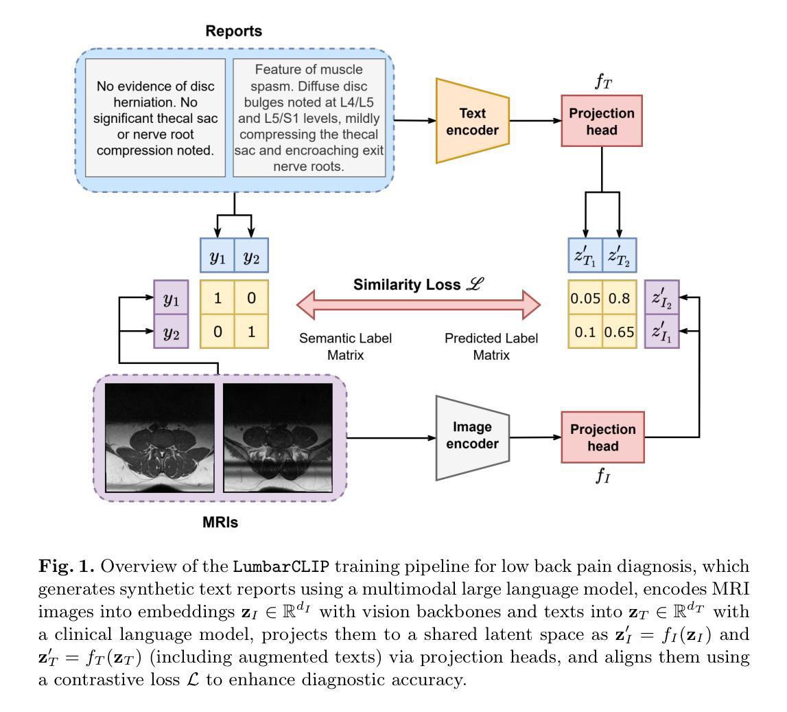 - 它利用对比语言图像预训练技术,将腰椎MRI扫描与放射学描述对齐。