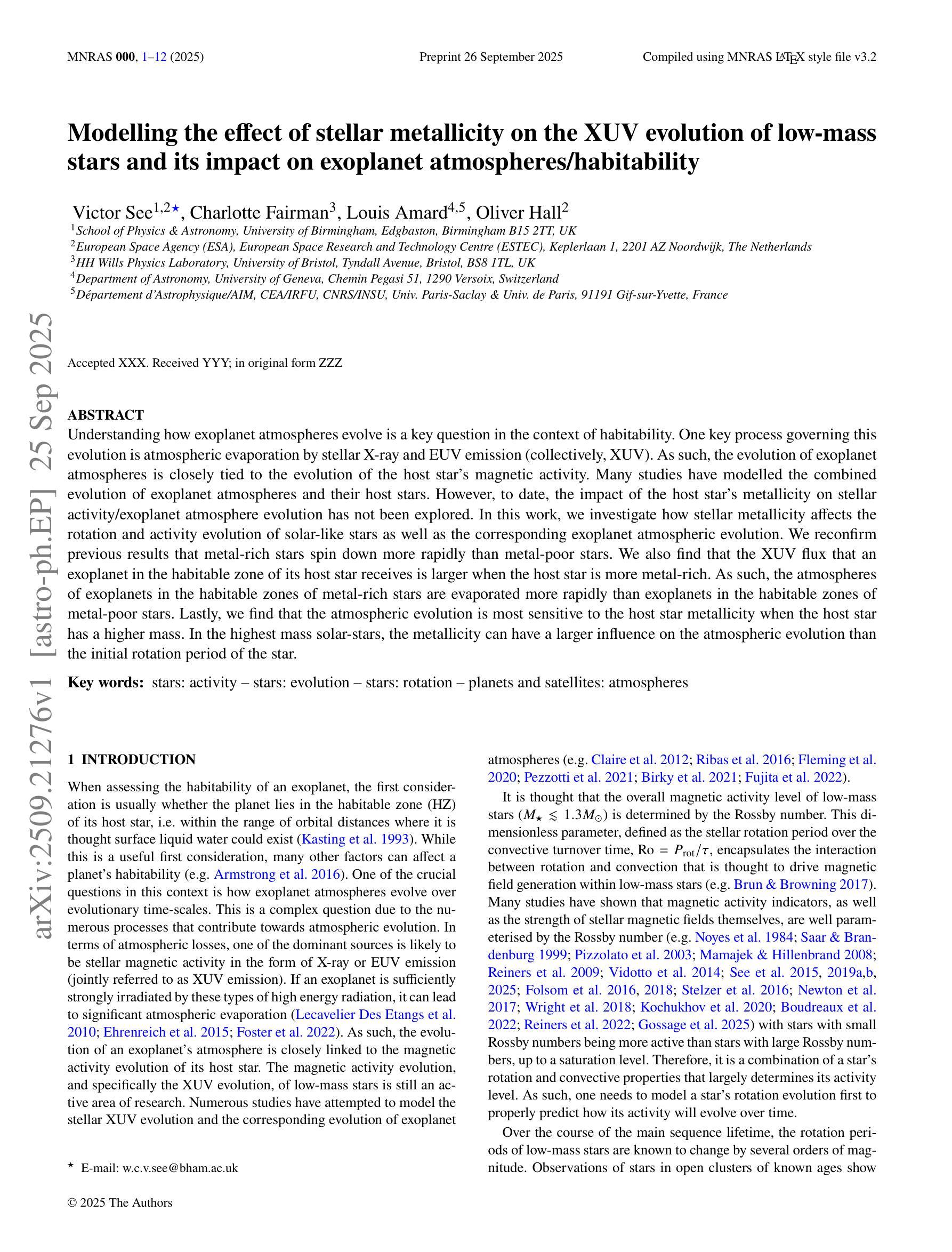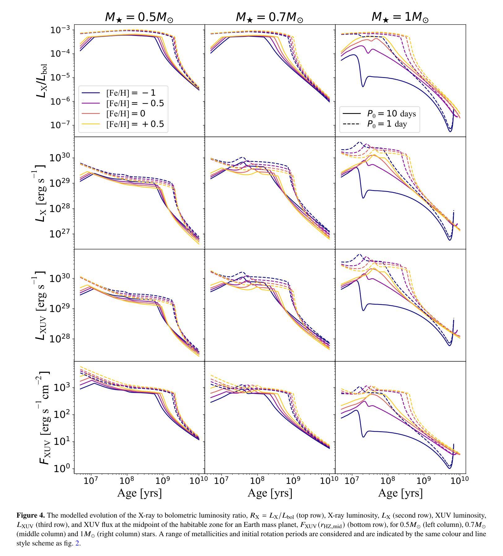 在宜居性的背景下,了解外行星大气如何演化是一个关键问题。控制这种演化的关键过程之一是恒星X射线和极紫外线(统称为XUV)辐射引起的大气蒸发。因此,外行星大气的演化与宿主星磁活动的演化密切相关。许多研究已经建立了外行星大气和其宿主星的共同演化模型。然而,迄今为止,宿主星的金属丰度对恒星活动/外行星大气演化的影响尚未被探索。在这项工作中,我们研究了恒星金属丰度对太阳型恒星的旋转和活动演化的影响,以及相应的外行星大气演化。我们再次证实了之前的结论,即富金属恒星的自旋衰减速度比贫金属恒星更快。我们还发现,当宿主星为富金属时,处于宜居带的外行星接收到的XUV流量更大。因此,处于富金属星宜居区的外行星大气比处于贫金属星宜居区的外行星大气蒸发得更快。最后,我们发现当宿主星质量较高时,大气演化对宿主星金属丰度的敏感性最强。在质量最高的太阳型恒星中,金属丰度对大气演化的影响可能大于恒星的初始自转周期。