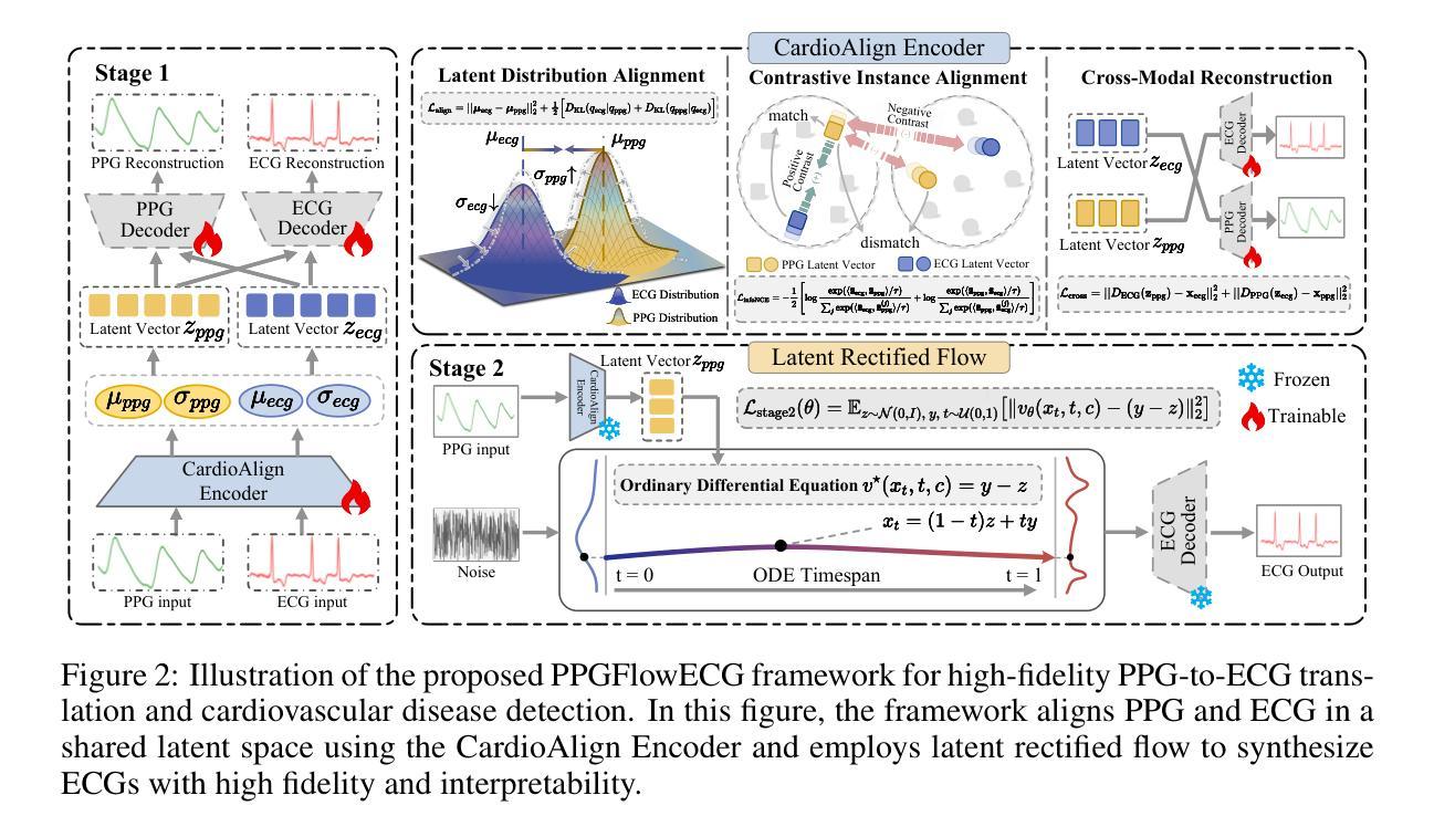 - 该框架包括一个两阶段过程,通过CardioAlign Encoder在共享潜在空间中对PPG和ECG进行对齐。
