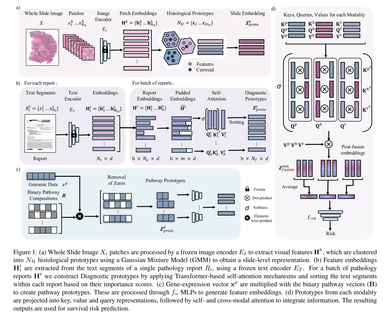 - WSIs与病理学报告的融合面临挑战,因为两者的维度和性质不同(WSIs高维,而报告文本简短)。