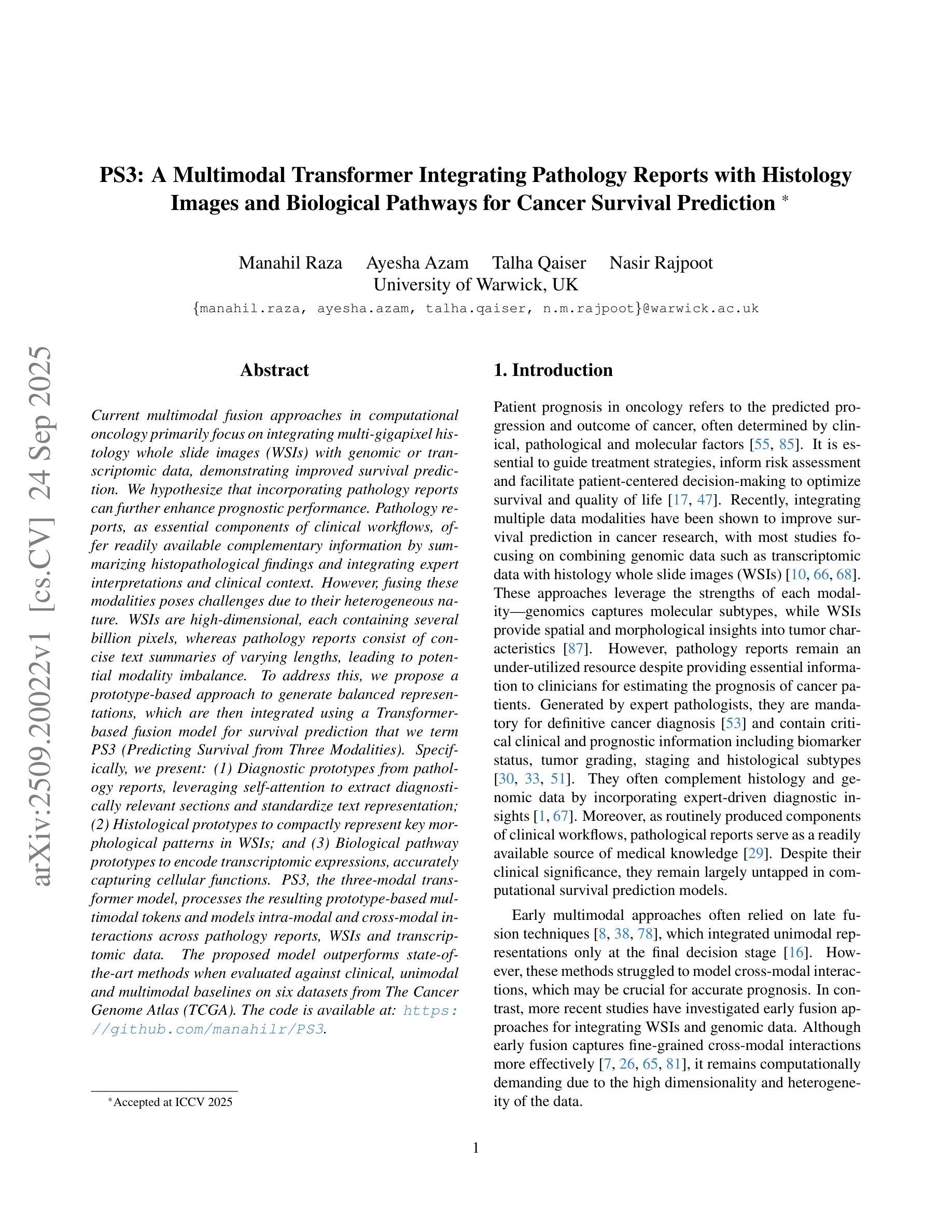当前计算肿瘤学中的多模态融合方法主要集中在将多千兆像素全切片图像(Whole Slide Images, WSI)与基因组或转录组数据进行整合,以改善生存预测。我们假设加入病理报告可以进一步提高预后性能。作为临床工作流程的重要组成部分,病理报告通过总结病理组织学发现、整合专家解读和临床背景,提供了可轻易获得的补充信息。然而,由于这些模态的异质性,融合它们具有挑战性。全切片图像是高维的,每个图像都包含数十亿像素,而病理报告则包含不同长度的简洁文本摘要,这可能导致模态不平衡的问题。为解决这一问题,我们提出了一种基于原型的生成平衡表示的方法,然后使用基于Transformer的融合模型进行生存预测,我们称之为PS3(从三种模态预测生存)。具体来说,我们展示了:(1)来自病理报告的诊断原型,利用自注意力提取诊断相关的部分并标准化文本表示;(2)全切片图像中的组织原型,紧凑地表示关键形态模式;(3)转录组原型,编码转录组表达,准确捕获细胞功能。PS3三模态Transformer模型处理基于原型的多模态符号,并模拟病理报告、全切片图像和转录组数据之间的内部和外部交互作用。所提出的模型在来自癌症基因组图谱(TCGA)的六个数据集上进行了评估,与临床、单模态和多模态基线相比,表现出优于当前最新方法的效果。代码可在以下网址获取:https://github.com/manahilr/PS3。