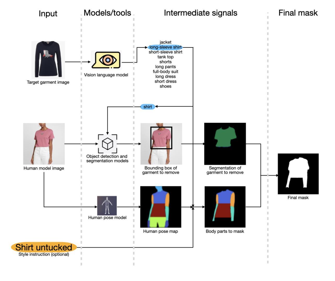 - InstructVTON利用视觉语言模型和图像分割模型自动生成掩膜。