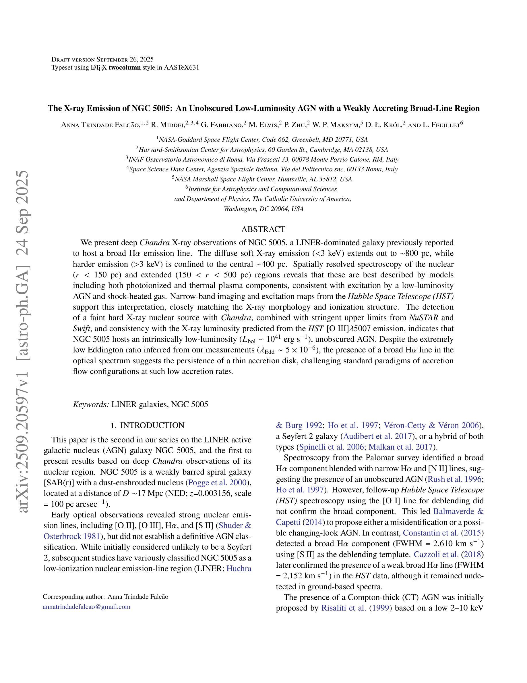 NGC 5005的深层钱德拉X射线观测揭示,其弥散软X射线发射延伸至约800 pc,硬发射更集中在中央约400 pc。核区和扩展区的空间解析光谱显示,包括光致电离和热等离子体成分在内的模型最能描述这些区域,与低光度活动星系核(AGN)激发和冲击加热气体的猜想一致。哈勃太空望远镜(HST)的窄带成像和激发图支持这一解释,与X射线形态和电离结构相匹配。钱德拉检测到的微弱硬X射线核源与NuSTAR和Swift的严格上限相一致,并与HST的[O III]λ5007发射预测的X射线光度一致,表明NGC 5005拥有一个内在低光度(Lbol ~ 1041 erg s-1)未遮蔽的活跃星系核。尽管从我们的测量中推断出极低的艾丁顿比率(λEdd ~ 5 × 10-6),但光学光谱中存在宽Hα线,暗示了薄盘的存在,对如此低吸积率下的标准吸积流配置提出了挑战。