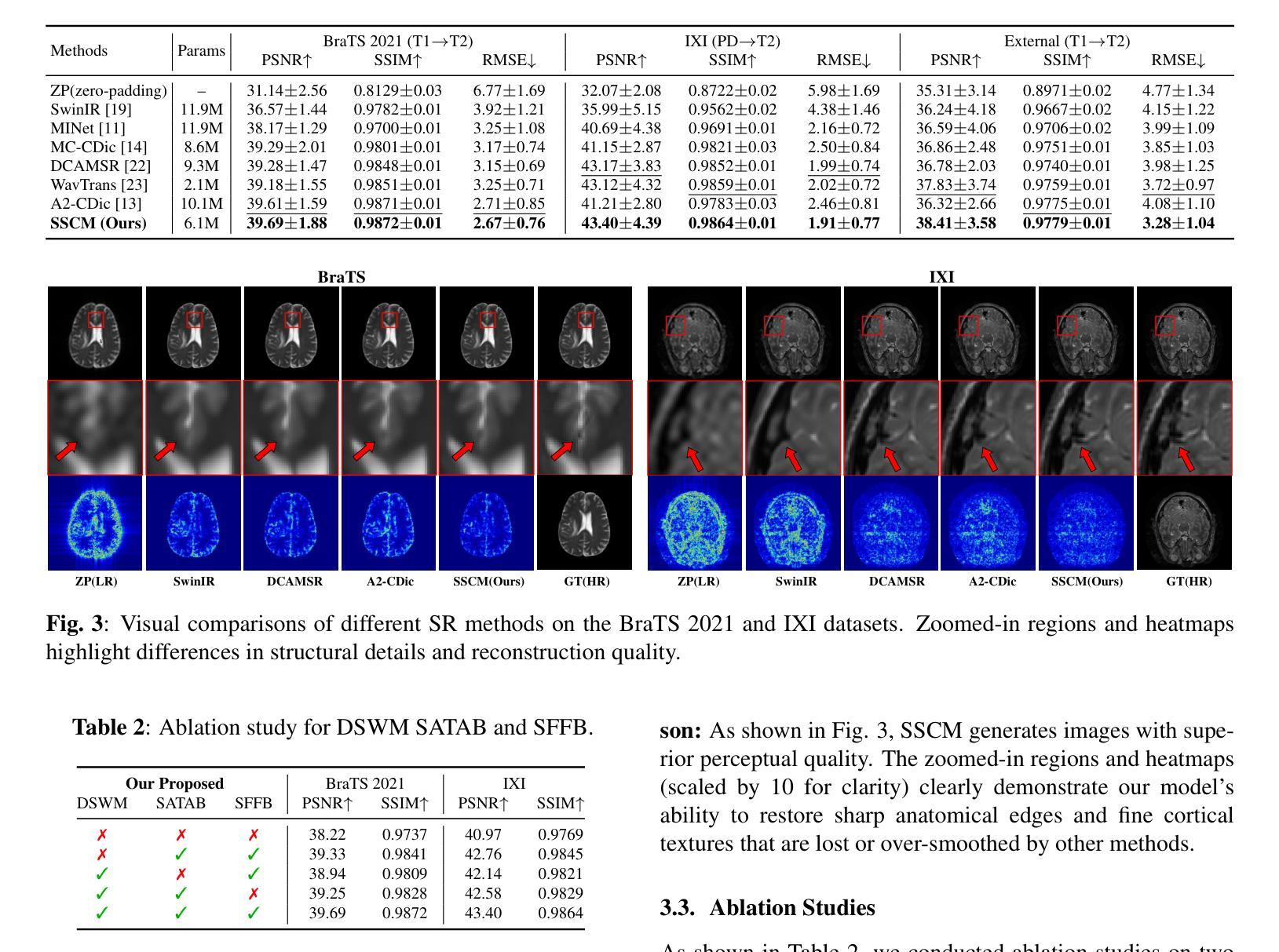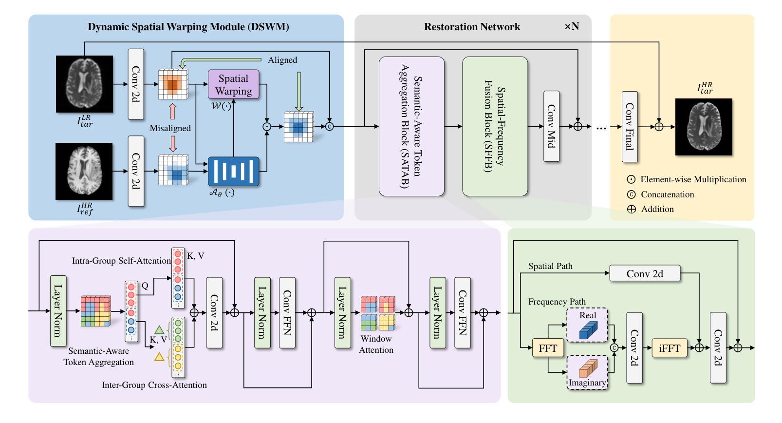多对比度磁共振成像超分辨率(MC-MRI SR)旨在利用高分辨率(HR)参考来增强低分辨率(LR)对比度,缩短采集时间,提高成像效率,同时保留解剖细节。主要挑战在于保持空间语义一致性,确保目标图像和参考图像之间的结构差异和运动情况下,解剖结构仍然保持良好的对齐和连贯性。传统方法不足以对空间语义一致性进行建模,并且没有充分利用频域信息,这导致精细对齐不佳以及高频细节恢复不足。在本文中,我们提出了空间语义一致模型(SSCM),该模型结合了动态空间扭曲模块进行跨对比度空间对齐,语义感知令牌聚合块实现长程语义一致性,以及空间频率融合块进行精细结构恢复。在公共和私有数据集上的实验表明,SSCM在参数更少的情况下实现了最先进的性能,同时确保了空间上和语义上的一致重建。