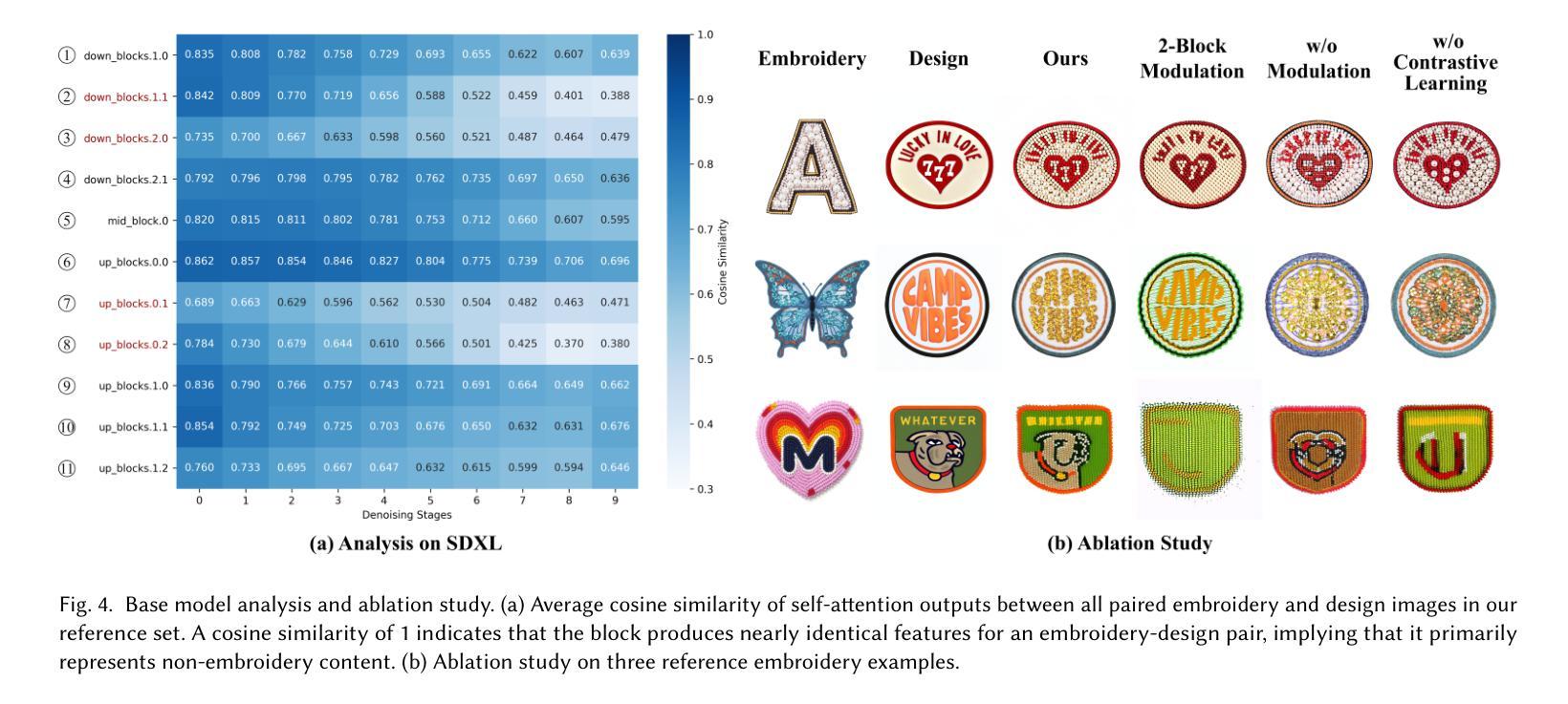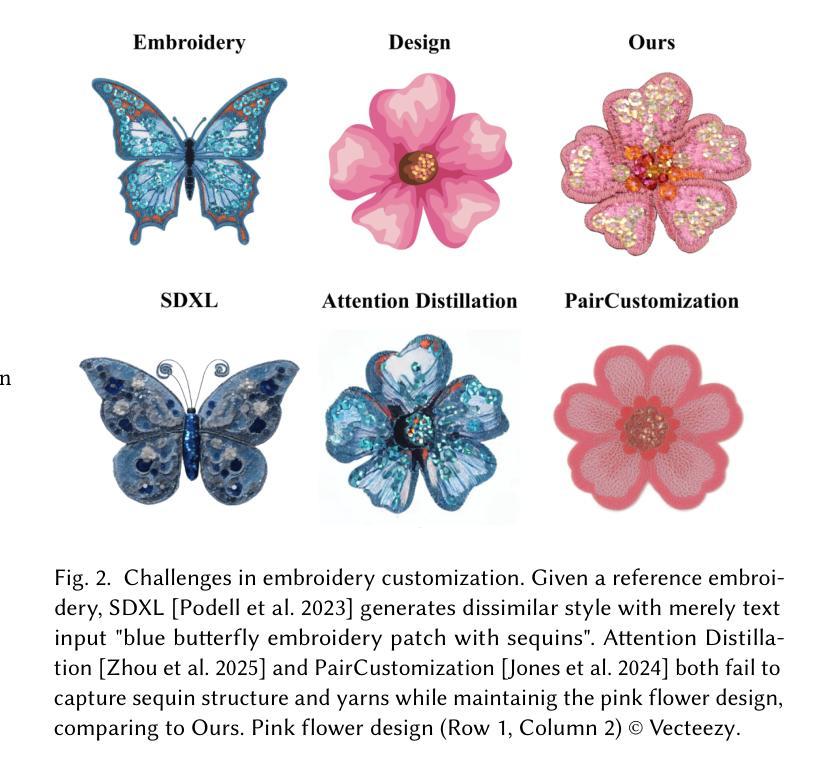 本文介绍了扩散模型在图像操纵技术中的显著进展,特别是在零售工作流程中的预销售可视化方面的应用。文章提出了一种新的对比学习框架,用于对刺绣等精细特征进行定制,通过单张参考图像解耦精细风格和内容特征,构建于图像类比的传统概念之上。采用基于预训练扩散模型的解耦表示相似性度量来实现风格与内容的分离,并提出两阶段对比LoRA调制技术来捕捉精细风格特征。最终建立了一个推理管道,可处理图像或文本输入,仅使用风格块。在建立刺绣定制的基准测试上,该方法超越了先前的方法,并进一步证明其在艺术风格转移、草图彩色化和外观转移等三个领域具有较强的通用性。