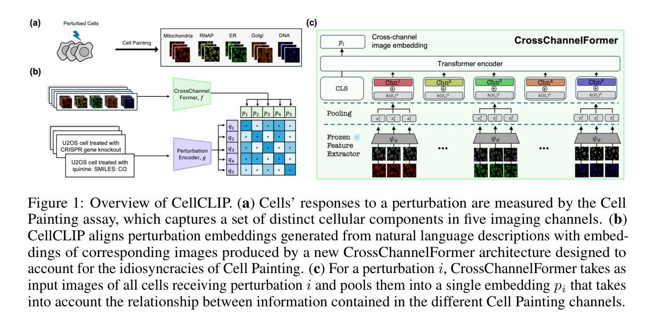 基于高内涵筛选(HCS)和高通量显微镜技术(如细胞染色法)的细胞形态学响应研究已实现了前所未有的规模。利用最新的跨模态对比学习技术,学习统一潜在空间以将扰动与其对应的形态效应对齐,有望推动这一领域的研究进展。但应用于HCS数据的挑战包括图像语义差异大及难以代表不同类别的扰动等。为应对这些挑战,本文提出CellCLIP框架,结合预训练图像编码器、新型通道编码方案及自然语言编码器,以更好地捕捉图像嵌入中的关系并代表扰动。CellCLIP框架表现优于现有开源模型,在跨模态检索和具有生物学意义的下游任务上均展现出最佳性能,并大大减少了计算时间。