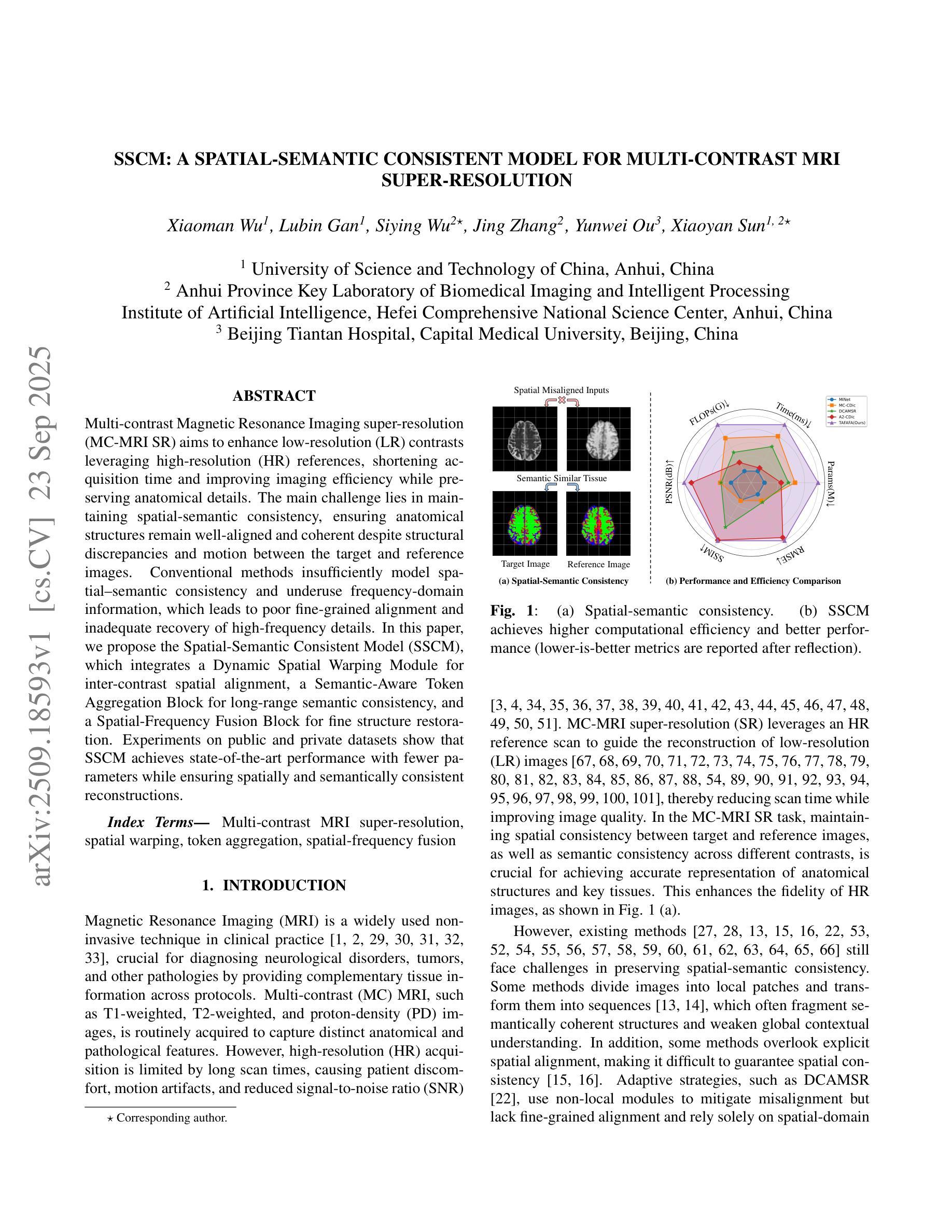 本文介绍了基于多对比度的磁共振成像超分辨率技术(MC-MRI SR),该技术旨在利用高分辨率参考图像提升低分辨率图像的对比度,以缩短采集时间并提高成像效率,同时保留解剖细节。研究的关键在于维持空间语义一致性,确保目标图像与参考图像之间的结构对齐和语义连贯性。文章提出了一种新的空间语义一致性模型(SSCM),该模型结合了动态空间变形模块进行跨对比度空间对齐、语义感知令牌聚合块进行长距离语义一致性以及空间频率融合块进行精细结构恢复。实验表明,SSCM在公共和私有数据集上实现了卓越的性能,参数更少,同时保证了空间语义一致的重建。