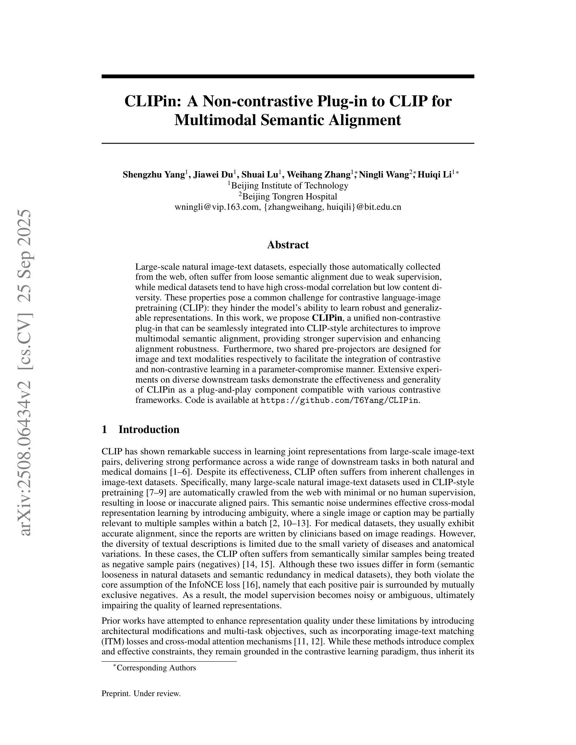 Large-scale natural image-text datasets, especially those automatically collected from the web, often suffer from loose semantic alignment due to weak supervision, while medical datasets tend to have high cross-modal correlation but low content diversity. These properties pose a common challenge for contrastive language-image pretraining (CLIP): they hinder the model’s ability to learn robust and generalizable representations. In this work, we propose CLIPin, a unified non-contrastive plug-in that can be seamlessly integrated into CLIP-style architectures to improve multimodal semantic alignment, providing stronger supervision and enhancing alignment robustness. Furthermore, two shared pre-projectors are designed for image and text modalities respectively to facilitate the integration of contrastive and non-contrastive learning in a parameter-compromise manner. Extensive experiments on diverse downstream tasks demonstrate the effectiveness and generality of CLIPin as a plug-and-play component compatible with various contrastive frameworks. Code is available at https://github.com/T6Yang/CLIPin.