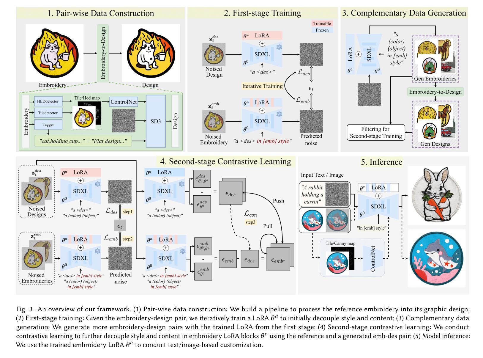 扩散模型在图像操作技术上取得了显著进展,其在生成逼真图像方面的能力开始改变零售工作流程,特别是在售前可视化方面。除了艺术风格转换,执行精细粒度视觉特征转换的能力变得愈发重要。刺绣是一种纺织艺术形式,其特征在于各种刺绣图案和材料属性的复杂交织,这给现有的风格转换方法带来了独特挑战。为了探索此类精细粒度特征的定制,我们提出了一种新颖的对比学习框架,该框架利用单张参考图像来分离精细粒度风格和内容特征,基于图像类比的经典概念。我们首先构建一对图像来定义目标风格,然后采用基于预训练扩散模型的解耦表示相似性度量来进行风格内容分离。随后,我们提出了一个两阶段的对比LoRA调制技术来捕捉精细粒度风格特征。在第一阶段,我们迭代更新整个LoRA和所选的风格块来初步分离风格和内容。在第二阶段,我们设计了一种对比学习策略,通过自我知识蒸馏进一步解耦风格和内容。最后,我们建立了一个推理管道来处理只有风格块的图像或文本输入。为了评估我们在精细粒度风格转换方法上的表现,我们为刺绣定制建立了一个基准测试。我们的方法在这个任务上超越了以前的方法,并进一步证明了在三个额外领域:艺术风格转换、草图颜色化和外观转换中具有强大的泛化能力。