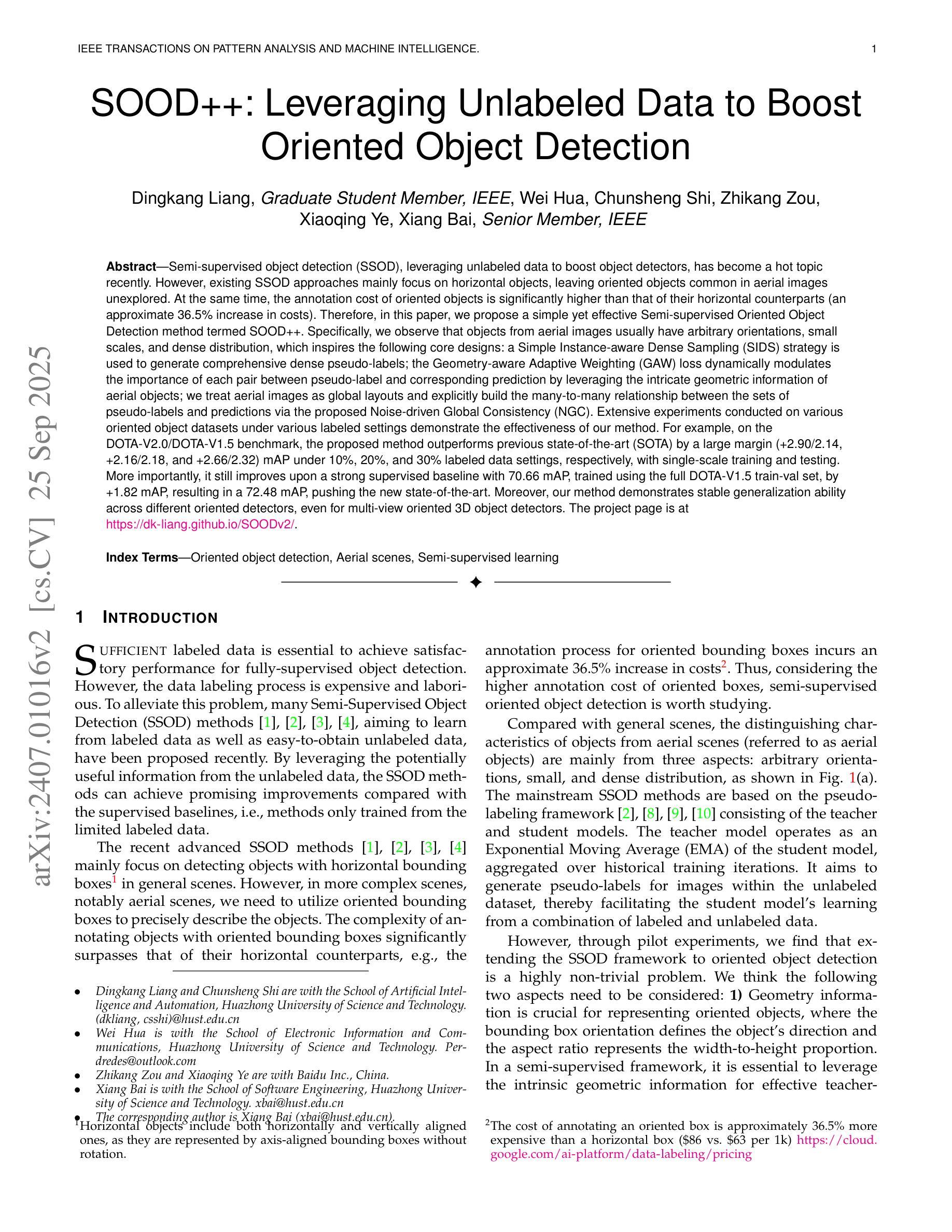 半监督目标检测(SSOD)利用无标签数据来提升目标检测器的性能,这最近成为了一个热门话题。然而,现有的SSOD方法主要关注水平目标,忽略了在航空图像中常见的定向目标。同时,定向目标的标注成本显著高于其水平对应物。因此,本文提出了一种简单有效的半监督定向目标检测方法,称为SOOD++。具体来说,我们观察到航空图像中的目标通常具有任意方向、小尺寸和密集分布的特点,这启发我们进行了以下核心设计:采用简单实例感知密集采样(SIDS)策略生成全面的密集伪标签;几何感知自适应加权(GAW)损失通过利用航空目标的复杂几何信息,动态调整伪标签和相应预测之间每对的重要性;我们将航空图像视为全局布局,并通过提出的噪声驱动全局一致性(NGC)明确建立了伪标签集和预测集之间的多对多关系。在各种定向目标数据集上进行的广泛实验表明,我们的方法在各种标注设置下都是有效的。例如,在DOTA-V2.0/DOTA-V1.5基准测试上,与之前的最新技术相比,该方法在10%、20%和30%标注数据设置下,分别提高了(+2.90/2.14)、(+2.16/2.18)和(+2.66/2.32)mAP。更重要的是,即使在使用完整的DOTA-V1.5训练和验证集进行训练的强大监督基线之上,它仍然提高了+1.82 mAP,达到了72.48 mAP的新水平。项目页面是https://dk-liang.github.io/SOODv2/。