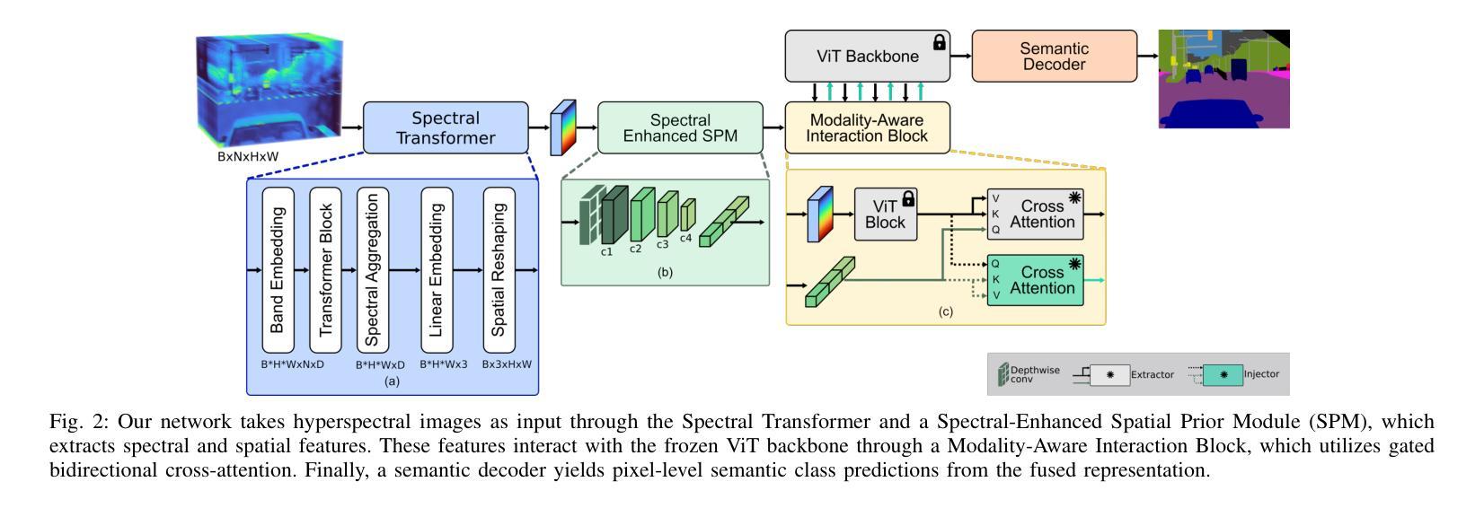 超光谱成像技术结合丰富的光谱内容和预训练的视觉基础模型,能有效提高机器在复杂环境下的感知能力。本工作提出了一种新颖的超光谱适配器,结合光谱转换器和光谱感知空间先验模块,实现空间光谱特征的丰富提取。通过引入模态感知交互块,实现了超光谱表示与冻结视觉转换器特征的有效融合。在三个自动驾驶数据集上的评估表明,该架构实现了最先进的语义分割性能。
