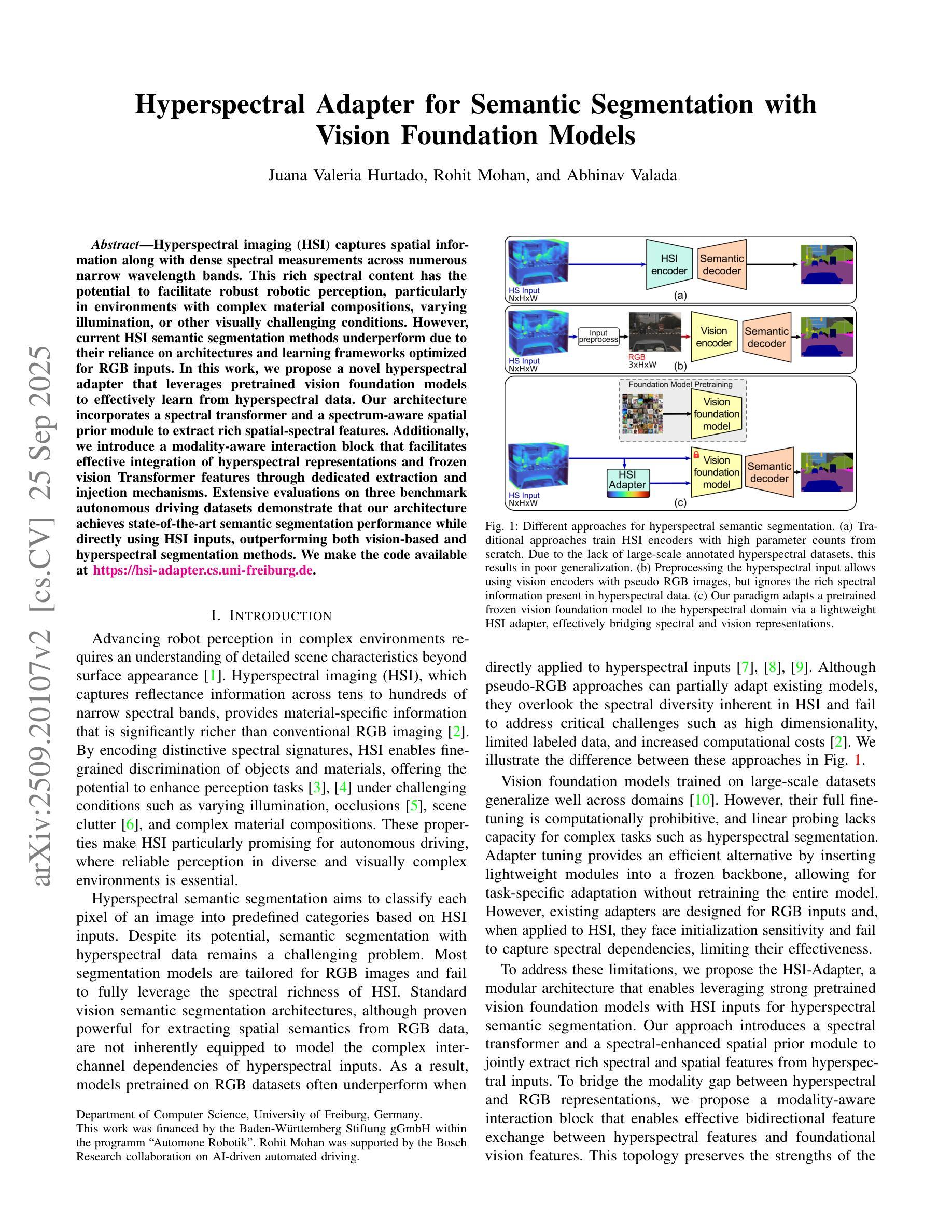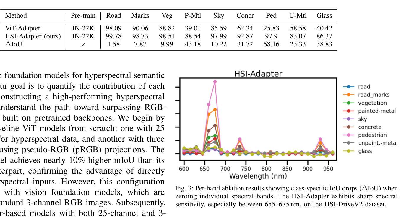 高光谱成像(HSI)能够捕获空间信息以及多个狭窄波长范围内的密集光谱测量值。这种丰富的光谱内容具有促进稳健的机器人感知的潜力,特别是在环境材料成分复杂、光照变化或其他视觉条件具有挑战性的环境中。然而,由于当前的高光谱图像语义分割方法依赖于针对RGB输入的架构和学习框架,导致其性能不佳。在这项工作中,我们提出了一种新型的高光谱适配器,它利用预训练的视觉基础模型来有效地从高光谱数据中学习。我们的架构结合了光谱变换器和光谱感知空间先验模块,以提取丰富的空间-光谱特征。此外,我们引入了一种模态感知交互块,通过专门的提取和注入机制,促进高光谱表示和冻结的视觉Transformer特征的有效融合。在三个基准自动驾驶数据集上的广泛评估表明,我们的架构实现了最先进的语义分割性能,同时直接使用HSI输入,超越了基于视觉和基于高光谱的分割方法。我们在https://hsi-adapter.cs.uni-freiburg.de上提供代码。