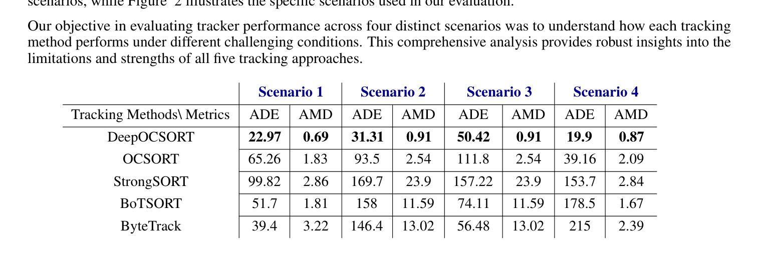 - DeepOCSORT在跟踪误差方面表现最佳,但存在跟踪漂移问题。