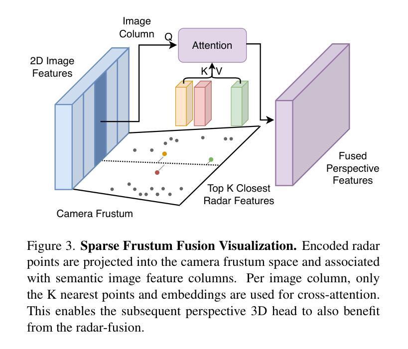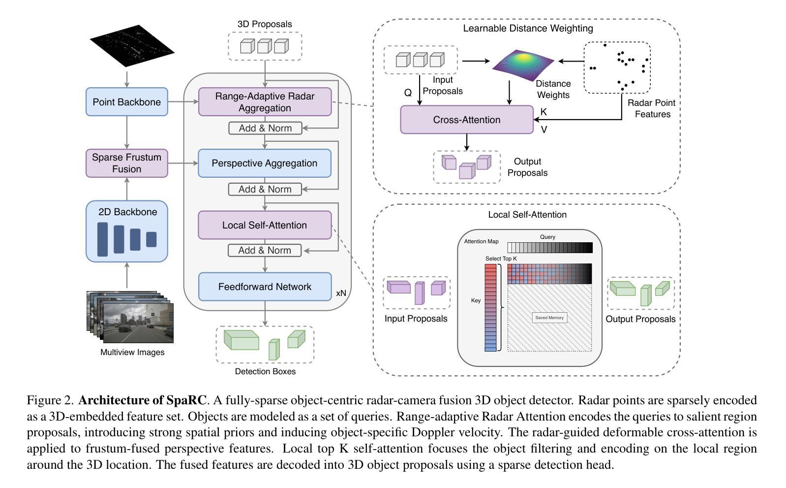 本文提出一种名为SpaRC的新型稀疏融合变压器,用于3D感知,它融合了多视角图像语义与雷达和相机的点特征。SpaRC通过稀疏棱镜融合(SFF)、范围自适应雷达聚合(RAR)和局部自注意力(LSA)等三项关键技术,解决了现有方法在假阳性检测和定位精度方面的挑战。与需要计算密集BEV网格的现有方法不同,SpaRC直接在编码的点特征上运行,提高了效率和准确性。在nuScenes和TruckScenes基准测试上的实证评估表明,SpaRC显著优于现有的密集BEV和稀疏查询检测器,达到了业界领先水平。