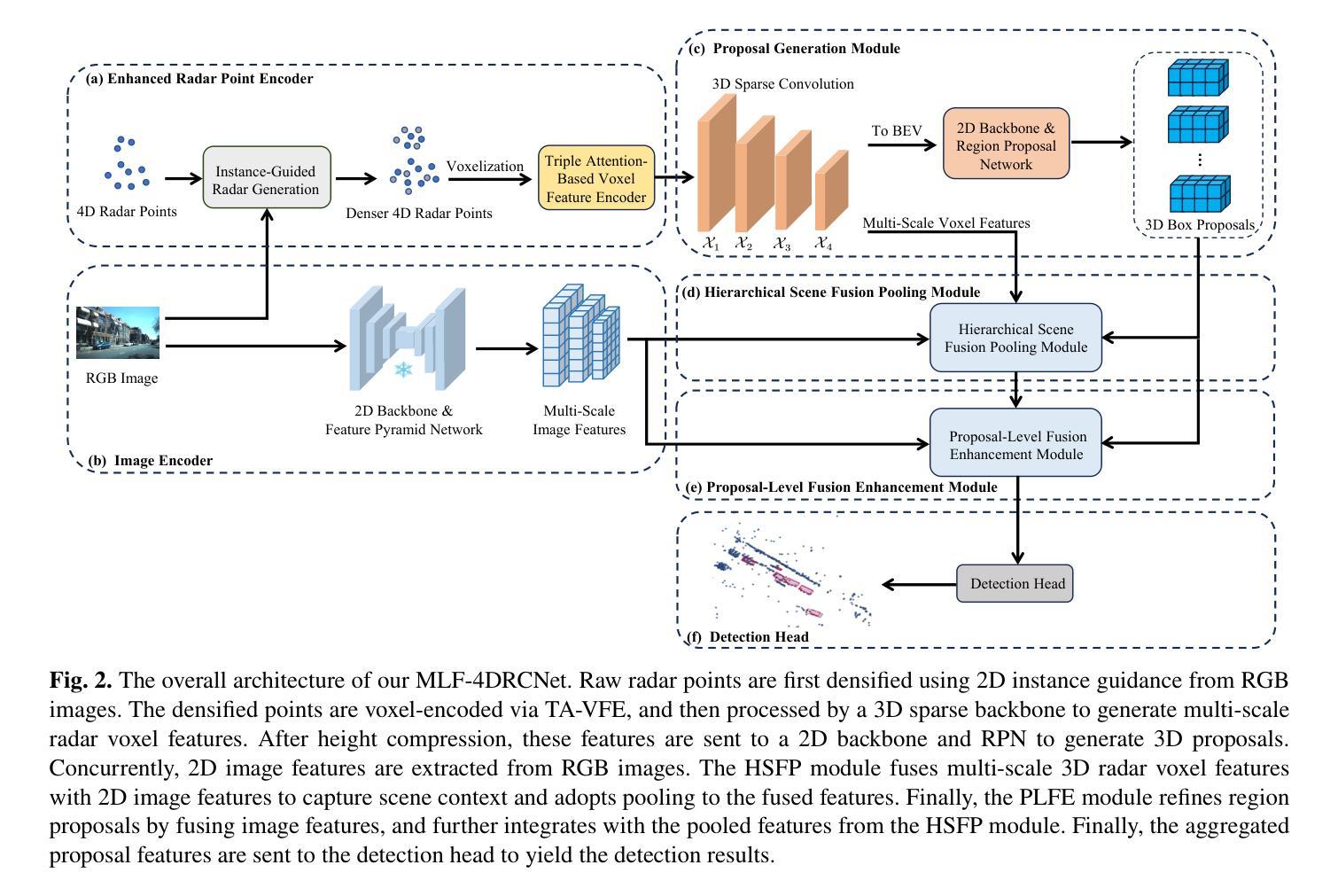 - MLF-4DRCNet包含三个关键组件:增强雷达点编码器(ERPE)、分层场景融合池化(HSFP)和提案级融合增强(PLFE)。