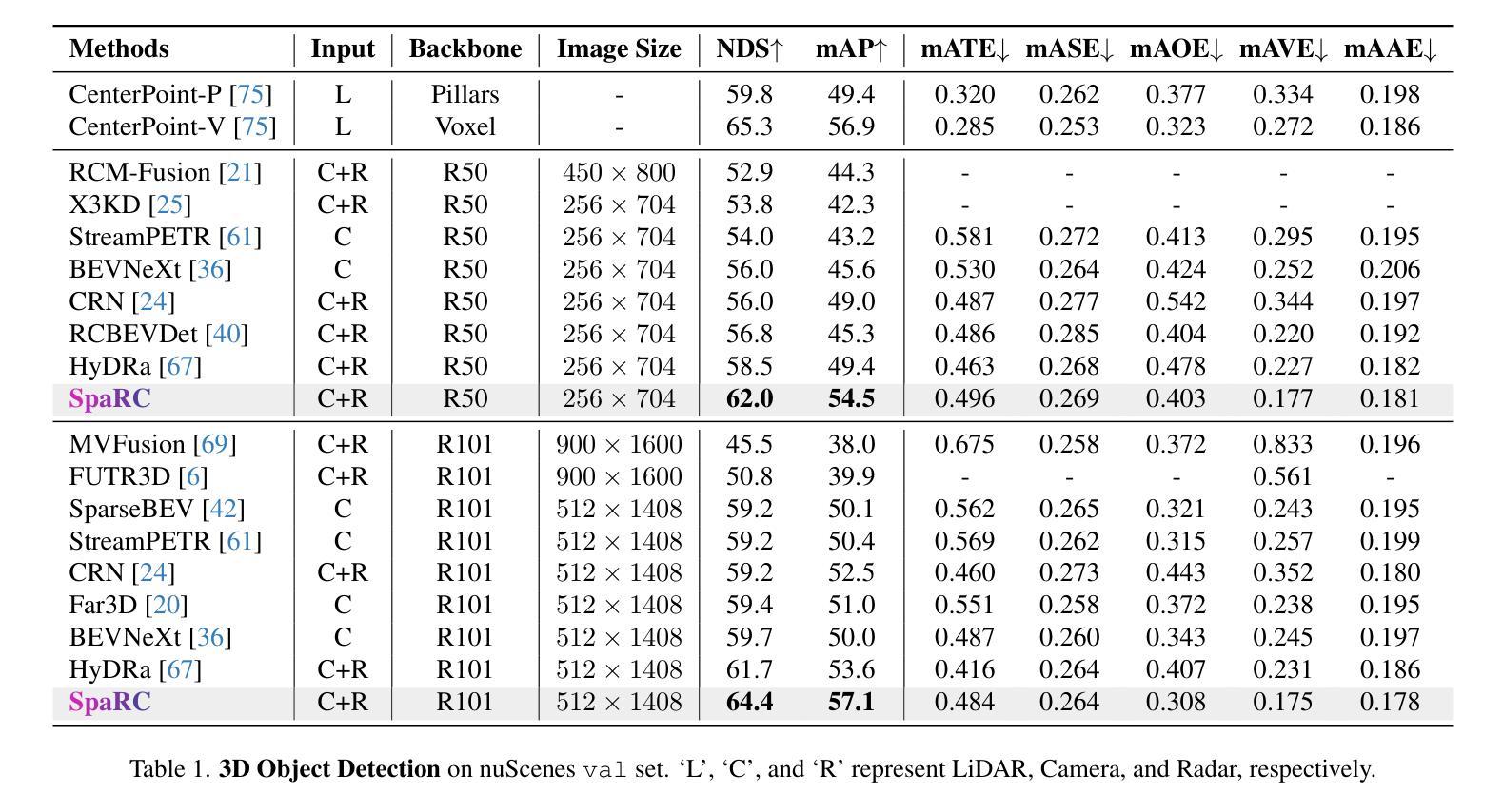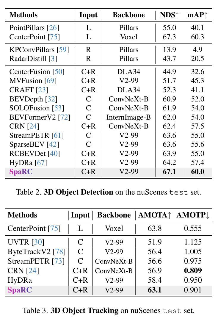 - SpaRC在nuScenes和TruckScenes基准测试上表现优异,显著优于现有方法。