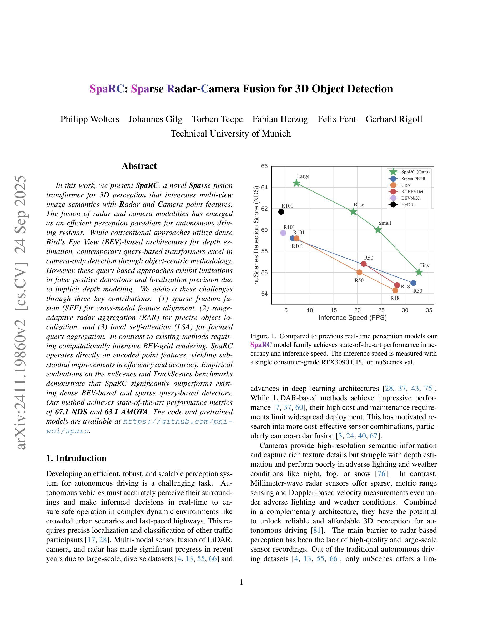 In this work, we present SpaRC, a novel Sparse fusion transformer for 3D perception that integrates multi-view image semantics with Radar and Camera point features. The fusion of radar and camera modalities has emerged as an efficient perception paradigm for autonomous driving systems. While conventional approaches utilize dense Bird’s Eye View (BEV)-based architectures for depth estimation, contemporary query-based transformers excel in camera-only detection through object-centric methodology. However, these query-based approaches exhibit limitations in false positive detections and localization precision due to implicit depth modeling. We address these challenges through three key contributions: (1) sparse frustum fusion (SFF) for cross-modal feature alignment, (2) range-adaptive radar aggregation (RAR) for precise object localization, and (3) local self-attention (LSA) for focused query aggregation. In contrast to existing methods requiring computationally intensive BEV-grid rendering, SpaRC operates directly on encoded point features, yielding substantial improvements in efficiency and accuracy. Empirical evaluations on the nuScenes and TruckScenes benchmarks demonstrate that SpaRC significantly outperforms existing dense BEV-based and sparse query-based detectors. Our method achieves state-of-the-art performance metrics of 67.1 NDS and 63.1 AMOTA. The code and pretrained models are available at https://github.com/phi-wol/sparc.