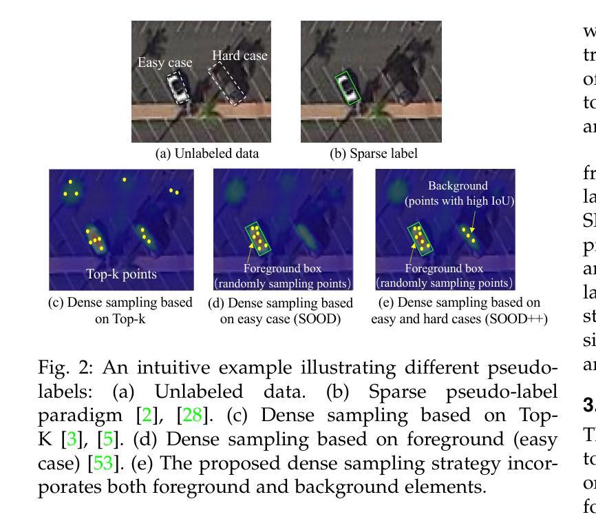 Summary:半监督目标检测(SSOD)利用无标签数据提升目标检测性能,当前主要关注水平目标检测,对空中图像中的定向目标检测研究不足。本文提出一种简单有效的半监督定向目标检测方法SOOD++,采用简单实例感知密集采样策略生成综合密集伪标签,利用空中目标的精细几何信息动态调整伪标签和对应预测之间的权重损失,并构建伪标签和预测之间的多对多关系。实验表明,该方法在多种定向目标数据集上的表现优于先前的方法。