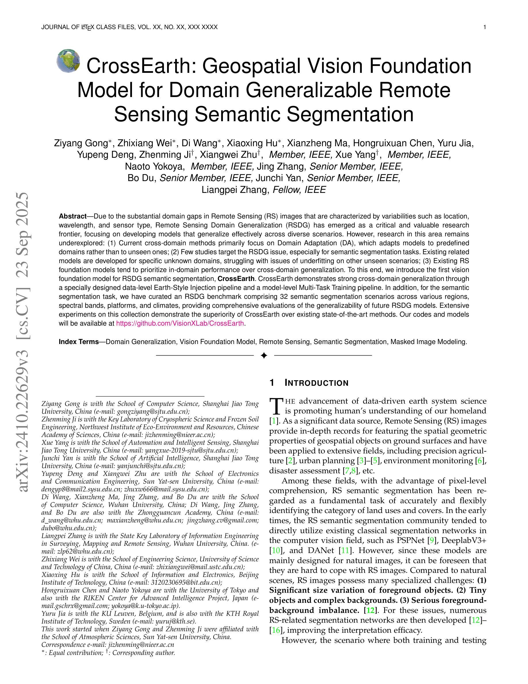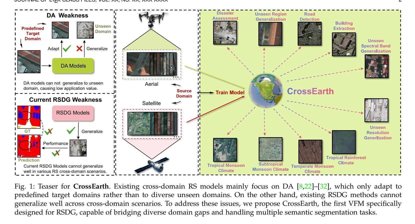 远程遥感领域通用化(RSDG)作为前沿研究领域,旨在发展能在不同场景中具有泛化效果的模型。当前该领域还存在一些挑战,如跨域方法的局限性、针对语义分割任务的模型泛化问题等。为解决这些问题,本文提出了首个针对RSDG语义分割的愿景基础模型CrossEarth,通过数据层面的地球风格注入和模型层面的多任务训练来提升模型的泛化能力。同时,本文还构建了一个包含多种区域、光谱波段、平台和气候的RSDG基准测试集,为未来模型的可泛化性测试提供了全面框架。实验证明,CrossEarth在基准测试上的表现优于现有最先进的方法。