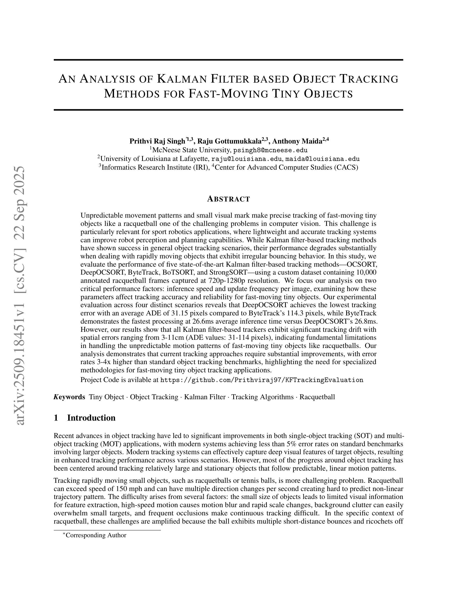 Unpredictable movement patterns and small visual mark make precise tracking of fast-moving tiny objects like a racquetball one of the challenging problems in computer vision. This challenge is particularly relevant for sport robotics applications, where lightweight and accurate tracking systems can improve robot perception and planning capabilities. While Kalman filter-based tracking methods have shown success in general object tracking scenarios, their performance degrades substantially when dealing with rapidly moving objects that exhibit irregular bouncing behavior. In this study, we evaluate the performance of five state-of-the-art Kalman filter-based tracking methods-OCSORT, DeepOCSORT, ByteTrack, BoTSORT, and StrongSORT-using a custom dataset containing 10,000 annotated racquetball frames captured at 720p-1280p resolution. We focus our analysis on two critical performance factors: inference speed and update frequency per image, examining how these parameters affect tracking accuracy and reliability for fast-moving tiny objects. Our experimental evaluation across four distinct scenarios reveals that DeepOCSORT achieves the lowest tracking error with an average ADE of 31.15 pixels compared to ByteTrack’s 114.3 pixels, while ByteTrack demonstrates the fastest processing at 26.6ms average inference time versus DeepOCSORT’s 26.8ms. However, our results show that all Kalman filter-based trackers exhibit significant tracking drift with spatial errors ranging from 3-11cm (ADE values: 31-114 pixels), indicating fundamental limitations in handling the unpredictable motion patterns of fast-moving tiny objects like racquetballs. Our analysis demonstrates that current tracking approaches require substantial improvements, with error rates 3-4x higher than standard object tracking benchmarks, highlighting the need for specialized methodologies for fast-moving tiny object tracking applications.