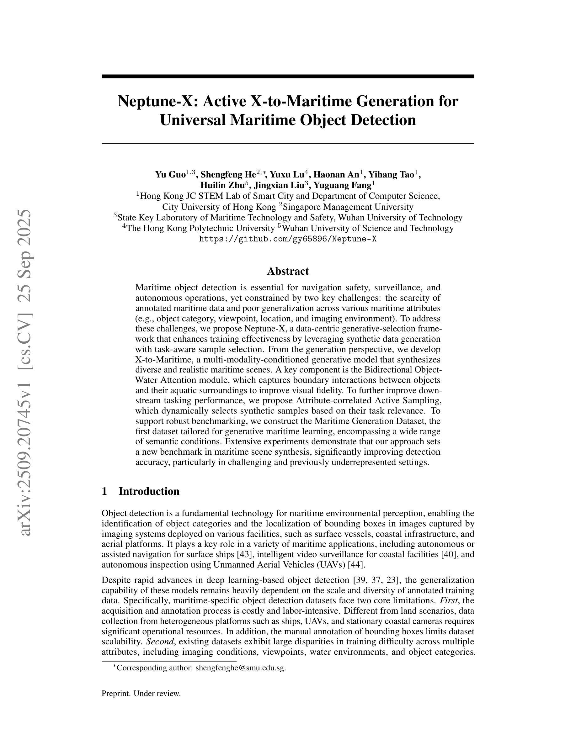 海洋目标检测对于航行安全、监控和自主操作至关重要,然而受到两个关键挑战的限制:海洋数据的标注稀缺以及不同海洋属性(如目标类别、观点、位置和成像环境)的泛化性能不佳。特别是在开放海域环境下,使用现有数据集训练的模型往往表现不佳。为了应对这些挑战,我们提出了Neptune-X,这是一个以数据为中心的生成选择框架,通过利用带有任务感知样本选择的合成数据生成,提高训练效果。从生成的角度来看,我们开发了X-to-Maritime多模式条件生成模型,合成多样且逼真的海洋场景。其中的关键组件是双向对象-水注意力模块,该模块捕获对象与其水生环境之间的边界交互,以提高视觉逼真度。为了进一步提高下游任务性能,我们提出了属性相关主动采样方法,该方法根据任务相关性动态选择合成样本。为了支持稳健的基准测试,我们构建了海洋生成数据集,这是专门为生成式海洋学习量身定制的第一个数据集,涵盖了广泛的语义条件。大量实验表明,我们的方法在海洋场景合成方面树立了新的基准,显著提高了检测精度,特别是在具有挑战性和先前表现不佳的环境中。代码可在https://github.com/gy65896/Neptune-X找到。