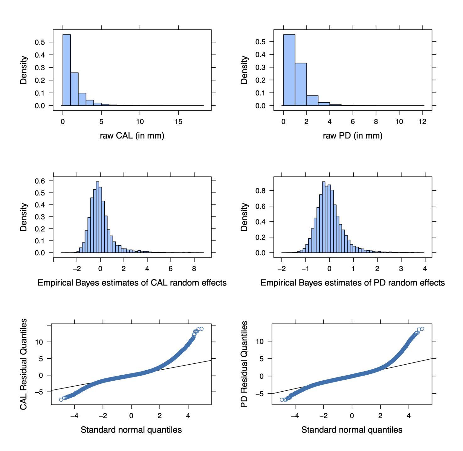 - 固定效应由斜率参数和单一递增指数函数构成,以捕捉牙周病进展的不同维度。