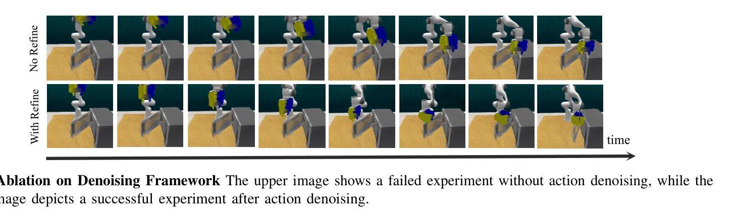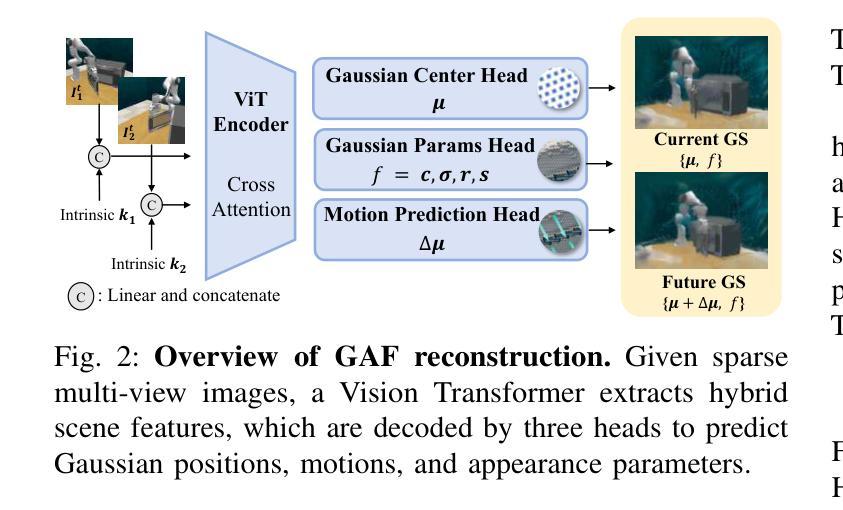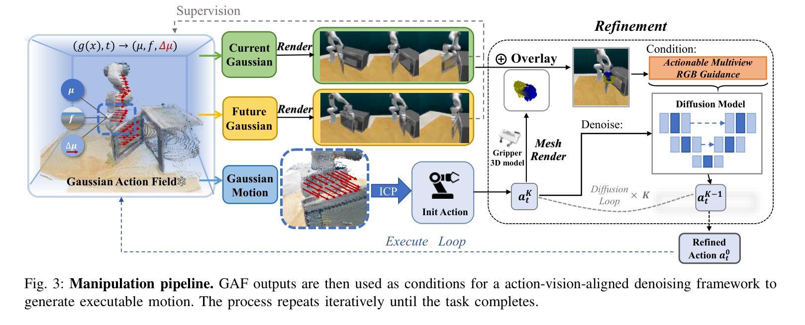 准确场景感知对于基于视觉的机器人操作至关重要。现有方法通常遵循视觉到动作(V-A)范式,直接从视觉输入预测动作,或者遵循视觉到三维到动作(V-3D-A)范式,利用中间三维表示。然而,这些方法通常由于操作场景的复杂性和动态性而面临动作不准确的问题。在本文中,我们采用了一种V-4D-A框架,该框架能够通过高斯动作场(GAF)从感知运动的4D表示中进行直接动作推理。GAF通过结合可学习的运动属性扩展了三维高斯拼贴(3DGS),允许对动态场景和操纵动作进行4D建模。为了学习随时间变化的场景几何和感知动作的机器人运动,GAF提供了三个相互关联的输出:当前场景的重建、未来帧的预测以及通过高斯运动估计的初始动作。此外,我们采用了一种与行动视觉对齐的去噪框架,该框架以由GAF生成的初始动作和高斯感知的结合的统一表示为条件,进一步获得更精确的动作。大量实验表明,GAF在重建质量方面实现了+11.5385分贝峰值信噪比(PSNR)、+0.3864结构相似性(SSIM)和-0.5574学习感知损失(LPIPS)的显著改善,同时在机器人操作任务上的成功率平均提高了+7.3%,超过了最先进的方法。