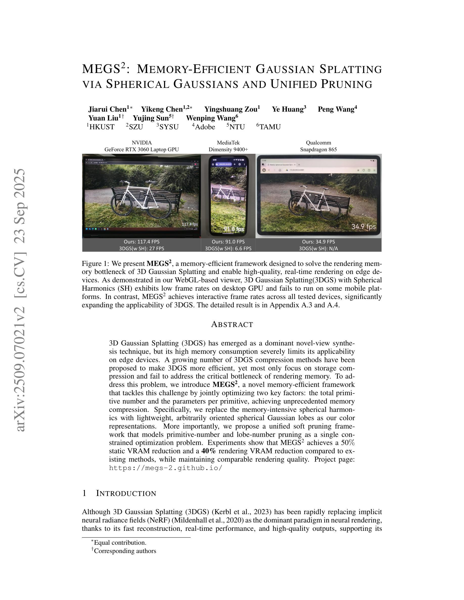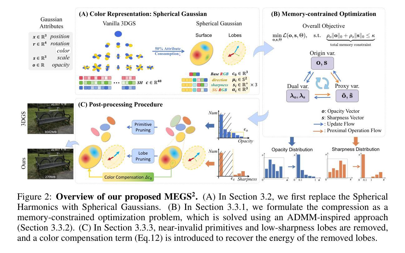 3D Gaussian Splatting(3DGS)是一种新兴的主流视图合成技术,但其高内存消耗严重限制了其在边缘设备上的应用。针对这一问题,提出了MEGS^2记忆效率框架,通过同时优化原始总数和每个原始参数两个关键因素,实现了前所未有的内存压缩。采用轻量级、任意定向球面高斯波瓣代替内存密集型球面谐波作为颜色表示,并提出统一的软修剪框架,将原始数量波瓣数和修剪数建模为一个约束优化问题。实验表明,与现有方法相比,MEGS^2可实现静态VRAM减少50%,渲染VRAM减少40%,同时保持相当的渲染质量。