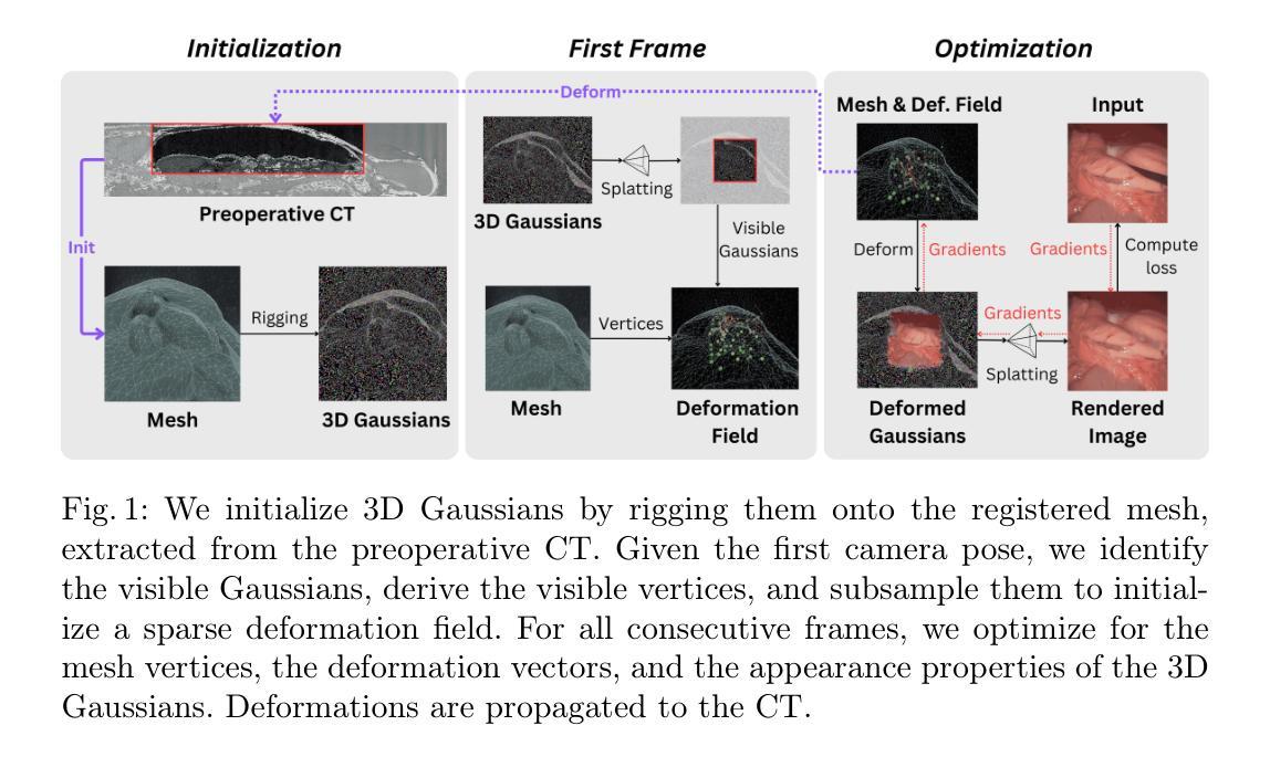 我们介绍了BridgeSplat,这是一种新型的变形手术导航方法。它将术中3D重建与术前CT数据相结合,以弥手术视频和患者体积数据之间的鸿沟。我们的方法将3D高斯映射到CT网格上,通过光度监督实现高斯参数和网格变形的联合优化。通过将每个高斯相对于其父网格三角形进行参数化,我们强制高斯和网格之间的对齐,并获取可以传播回以更新CT的变形。我们在模拟的猪内脏手术和模拟的人类肝脏合成数据上展示了BridgeSplat的有效性,在单目RGB数据上显示出术前CT的敏感变形。代码、数据和附加资源可以在https://maxfehrentz.github.io/ct-informed-splatting/找到。
