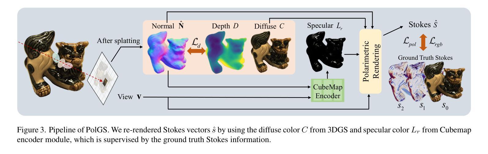 对于具有复杂反射属性的表面进行高效形状重建对实时虚拟现实至关重要。虽然基于三维高斯贴图(3DGS)的方法通过利用其明确的表面表示实现了快速的新视角渲染,但在重建质量方面仍落后于隐式神经表示,特别是在恢复具有复杂反射反射的表面时。为了解决这些问题,我们提出了PolGS,一种极坐标高斯贴图模型,可在10分钟内快速重建反射表面。通过将极坐标约束集成到3DGS框架中,PolGS有效地分离了镜面反射和漫反射成分,提高了对具有挑战性的反射材料的重建质量。在合成数据集和真实世界数据集上的实验结果验证了我们的方法的有效性。