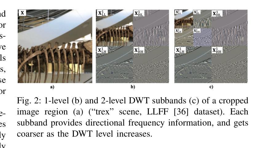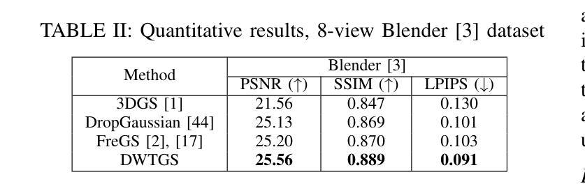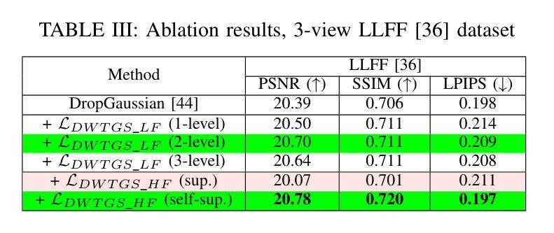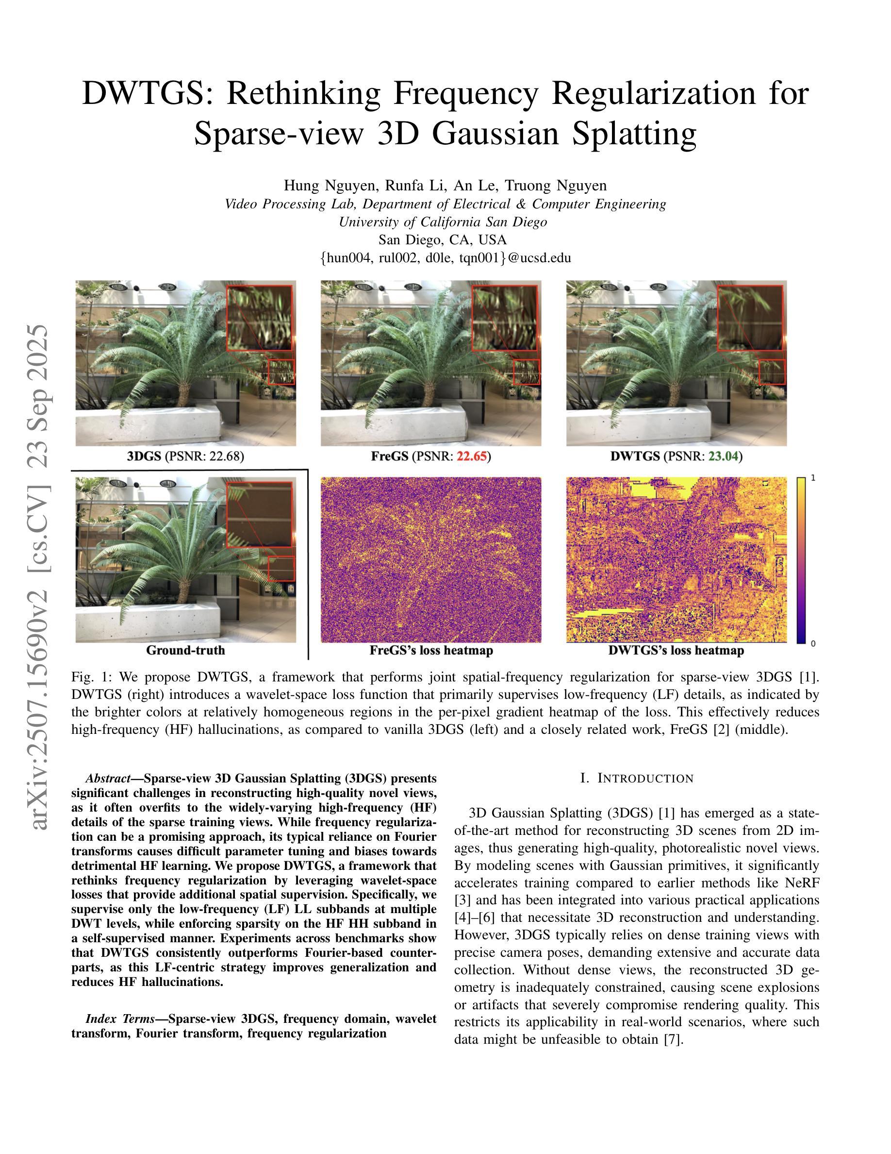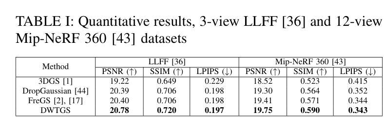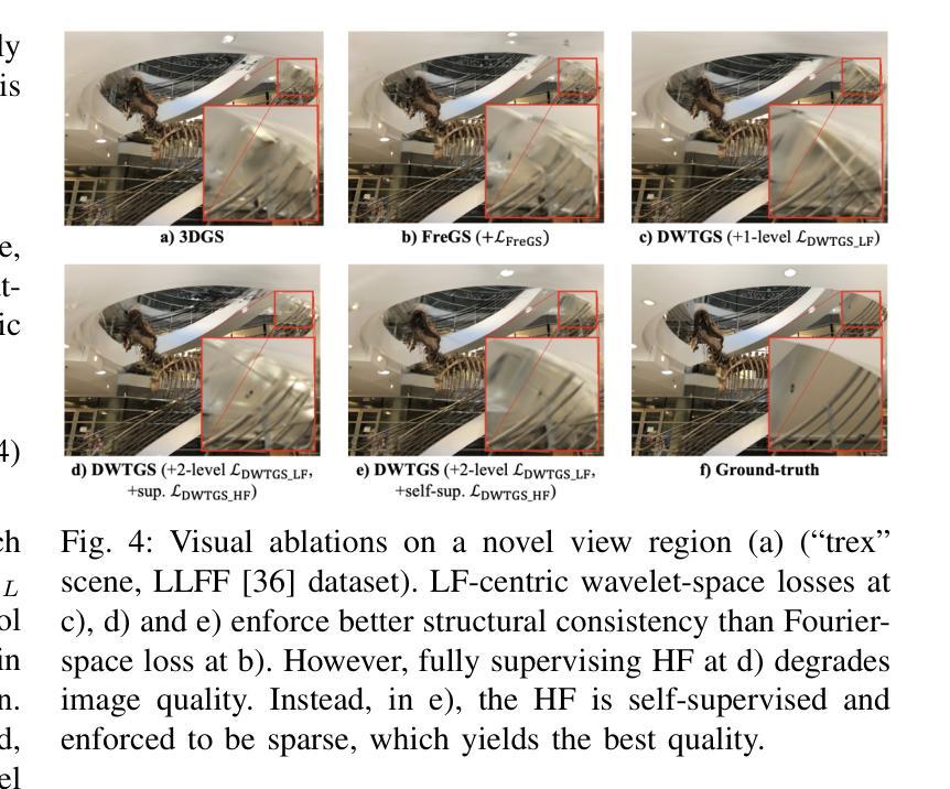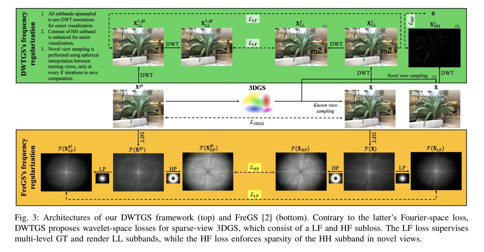 稀疏视角的3D高斯飞溅(3DGS)在重建高质量新颖视角方面存在重大挑战,因为它经常过度拟合稀疏训练视角中广泛变化的高频(HF)细节。虽然频率正则化可能是一种有前途的方法,但它通常依赖于傅里叶变换,导致参数调整困难,并偏向于有害的高频学习。我们提出了DWTGS,这是一个利用小波空间损失重新思考频率正则化的框架,它提供了额外的空间监督。具体来说,我们在多个DWT级别仅监督低频(LF)LL子带,同时以自我监督的方式在高频HH子带上强制执行稀疏性。跨基准的实验表明,DWTGS始终优于基于傅立叶的对应方法,因为这种以LF为中心的策略提高了泛化能力并减少了高频幻觉。