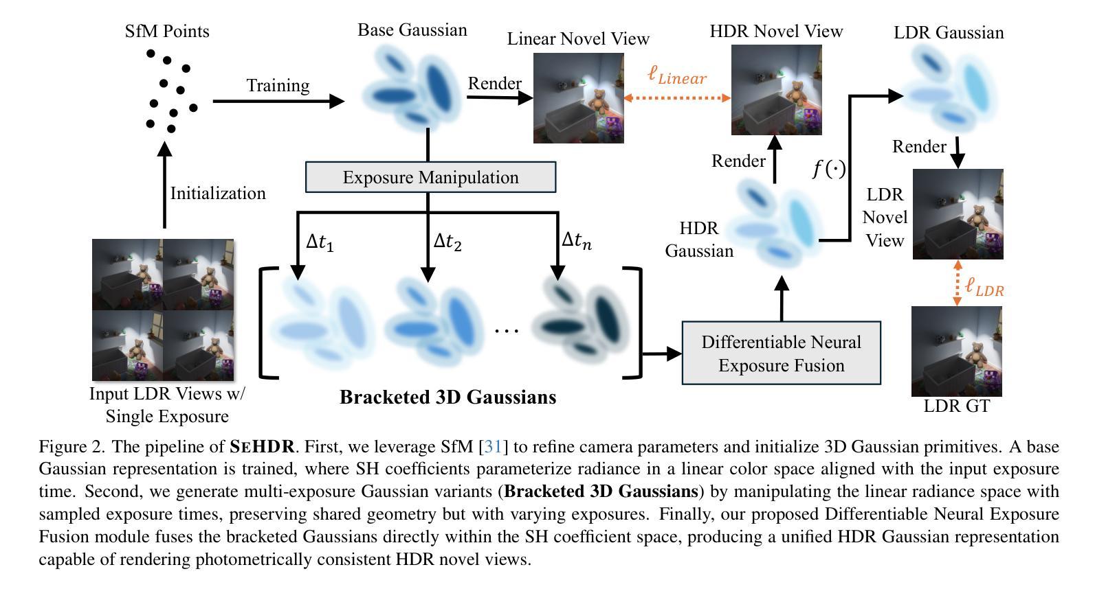 本文提出一种名为SeHDR的新型高动态范围三维高斯点喷绘技术(HDR-3DGS),可从多视角的低动态范围图像生成高动态范围的新视角图像。与其他方法不同,我们的方法不需要从不同曝光的多视角LDR图像中获取输入,避免了捕捉时的繁琐和可能出现的误差(如物体运动模糊和校准/对齐不准确)。我们的关键见解是,首先通过单曝光多视角LDR图像估计不同曝光的括号三维高斯,然后将其合并为HDR场景表示。具体来说,SeHDR首先从单曝光LDR输入中学习基础三维高斯,使用球面谐波在线性色彩空间中描述颜色。然后,我们估计具有相同几何形状但不同线性颜色的多个三维高斯,并根据曝光调整进行调整。最后,我们提出了可微神经曝光融合(NeEF)技术,将基础估计的三维高斯融合为HDR高斯,用于新型视角渲染。大量实验表明,SeHDR在性能上优于现有方法和精心设计的基线。