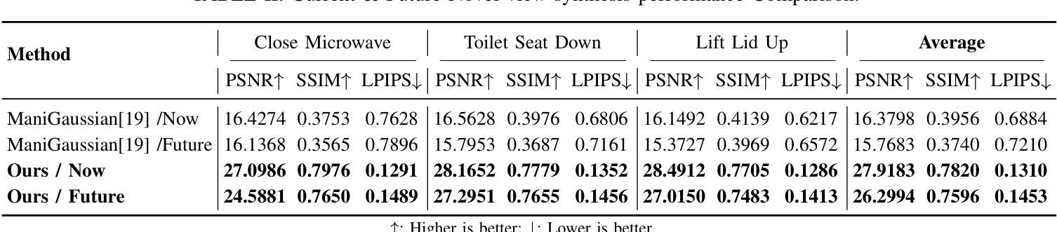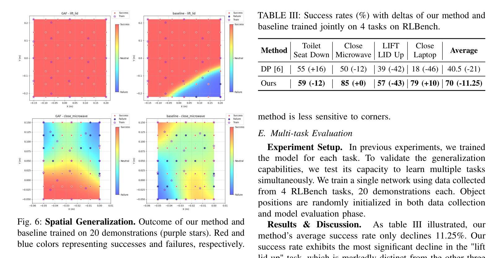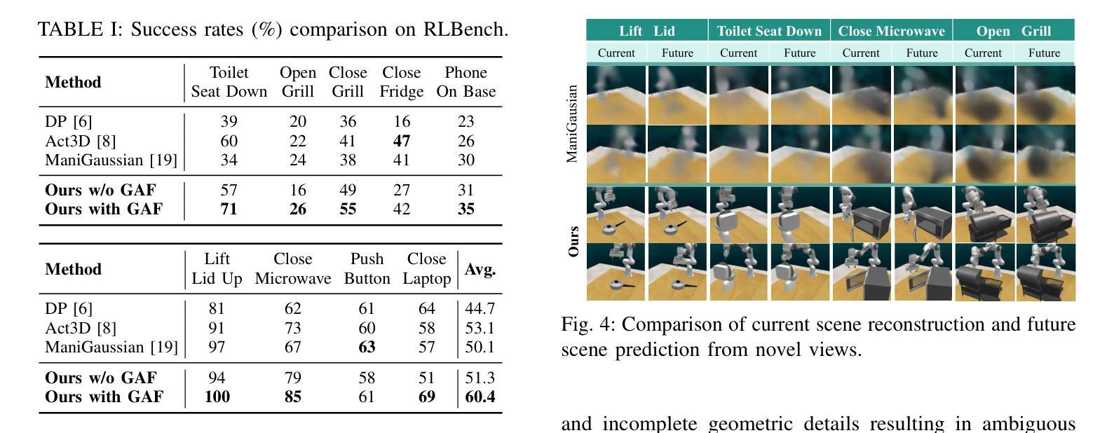 - 在机器人操作任务上,GAF较现有方法的成功率平均提升7.3%。