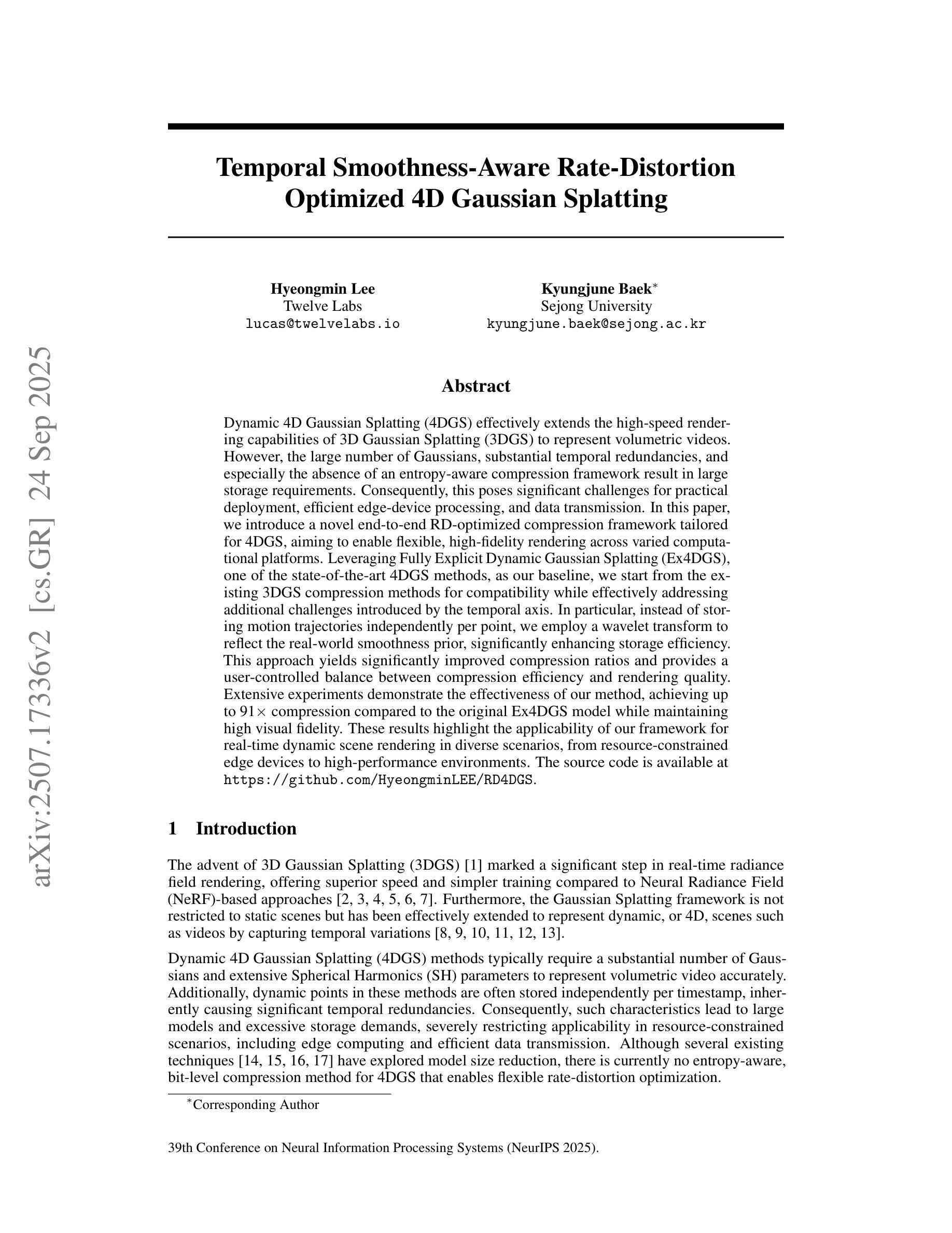 动态四维高斯映射(4DGS)有效地将三维高斯映射(3DGS)的高速渲染能力扩展到体积视频表示。然而,大量的高斯、大量的时间冗余以及缺乏熵感知压缩框架导致存储需求巨大。因此,这给实际部署、高效的边缘设备处理和数据传输带来了重大挑战。在本文中,我们针对4DGS引入了一种新型端到端RD优化压缩框架,旨在实现在各种计算平台上的灵活、高保真渲染。我们以目前最先进的动态高斯映射方法之一的全显式动态高斯映射(Ex4DGS)为基线,从现有的兼容性良好的三维高斯映射压缩方法出发,有效解决了由时间轴引入的额外挑战。特别是,我们没有像传统方法那样独立存储每个点的运动轨迹,而是采用小波变换来反映现实世界中的平滑先验知识,从而显著提高存储效率。这种方法实现了显著的压缩比,并在压缩效率和渲染质量之间提供了用户可控的平衡。大量实验证明了我们的方法的有效性,与原始Ex4DGS模型相比,我们的方法实现了高达91倍的压缩,同时保持了高度的视觉保真度。这些结果突显了我们的框架在资源受限的边缘设备到高性能环境的各种场景中实时动态场景渲染的适用性。源代码可在https://github.com/HyeongminLEE/RD4DGS找到。