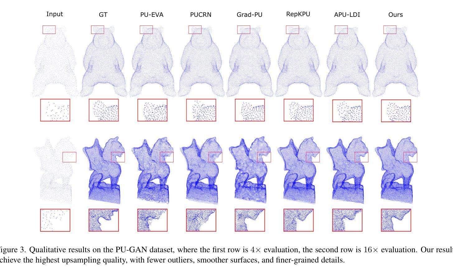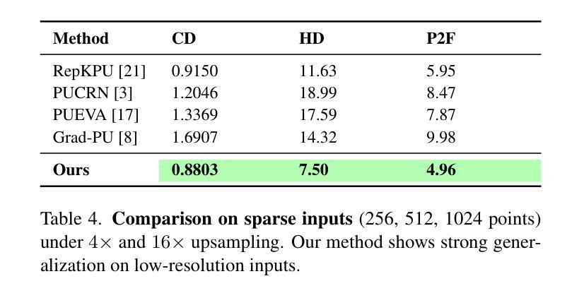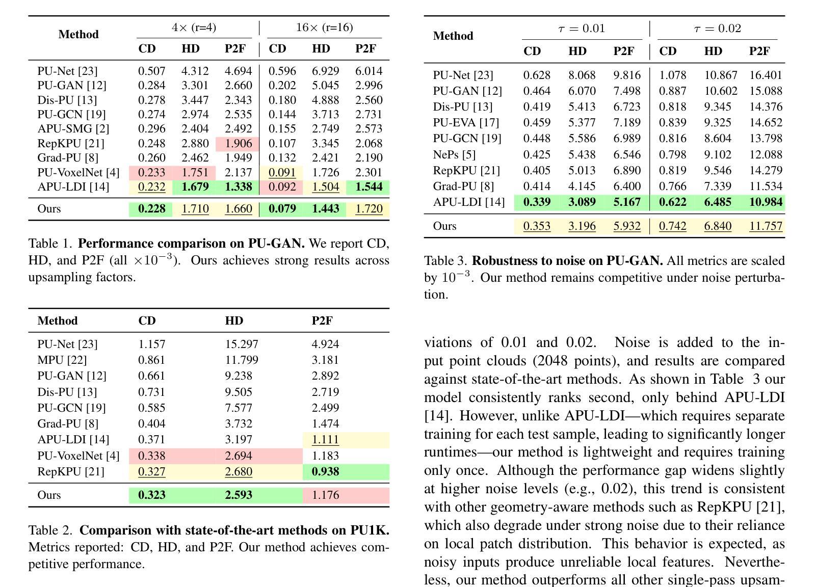 - 在PU1K和PUGAN数据集上的测试表明,PU-Gaussian性能达到最新水平。