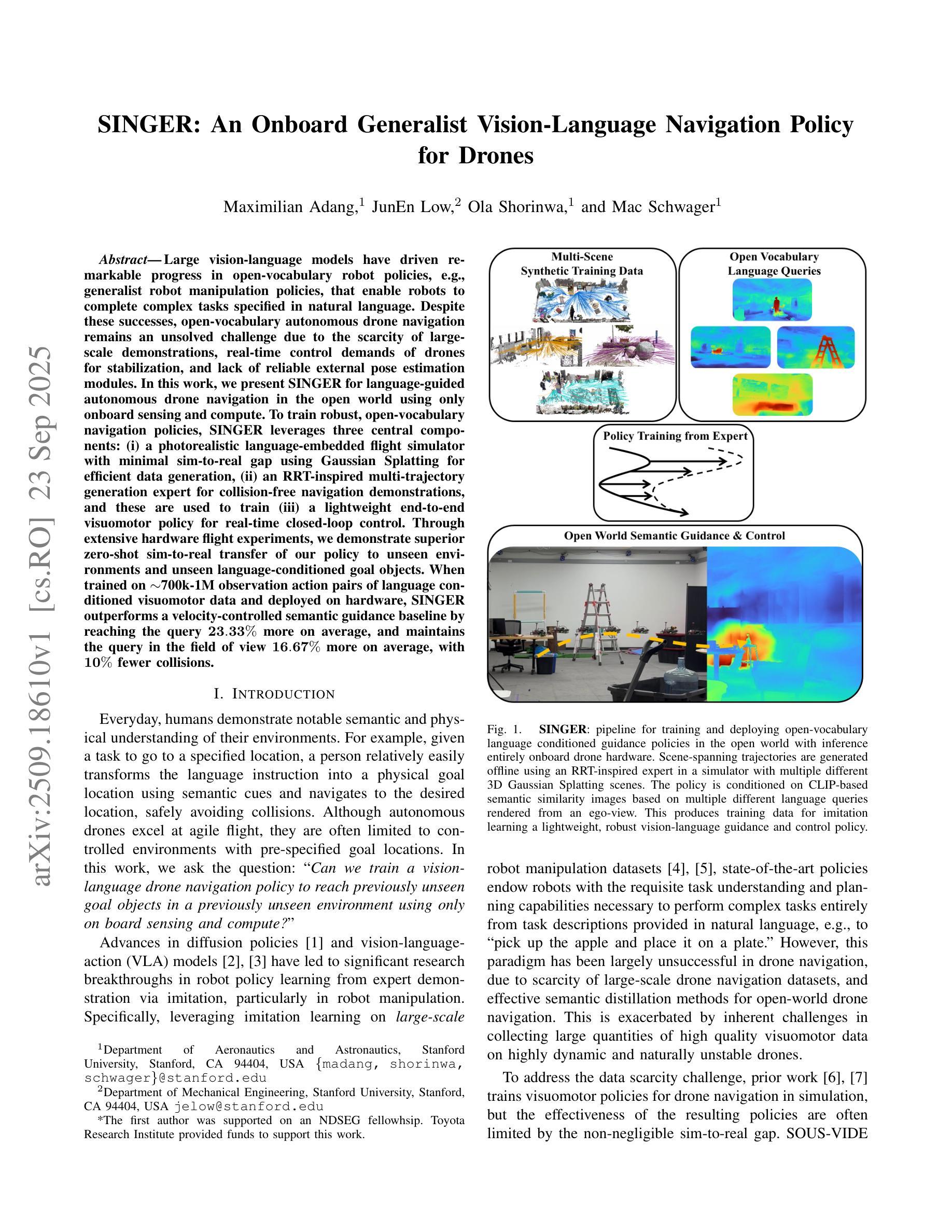 - SINGER通过使用真实语言嵌入飞行模拟器解决无人机导航问题,具备鲁棒性和开放词汇导航策略。