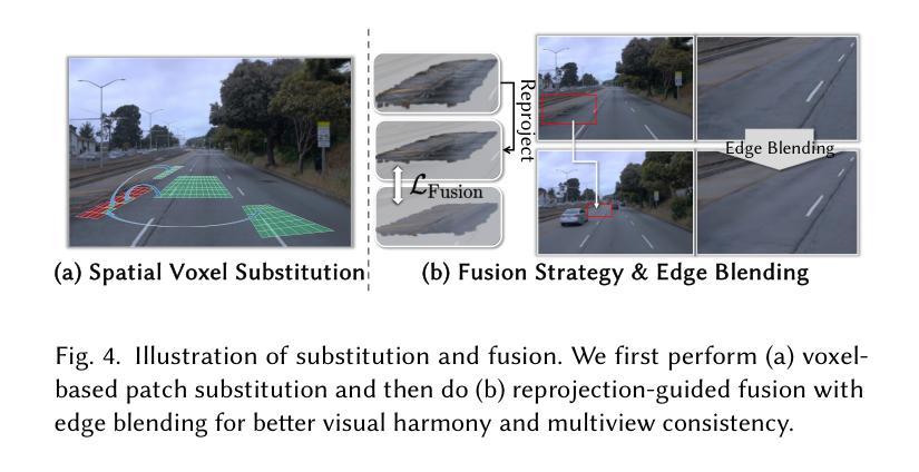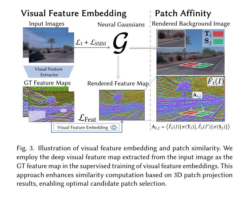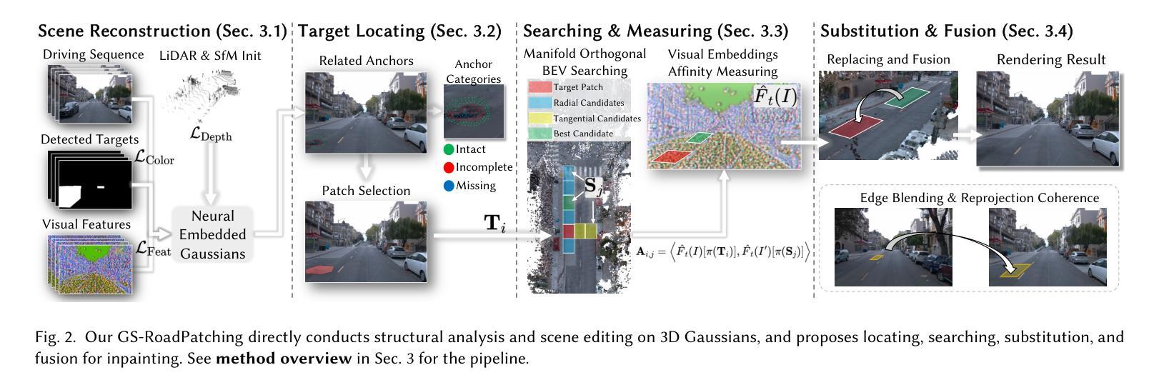 本文介绍了GS-RoadPatching,这是一种通过参考由三维高斯拼贴(3DGS)表示的完全重建区域来完成驾驶场景补全的内填方法。与传统的依赖于二维透视视图扩散或生成对抗网络(GAN)模型预测缺失区域的有限外观或深度线索的3DGS内填方法不同,我们的方法能够直接通过3DGS模式进行替代场景内填和编辑,无需依赖二维跨模态的时空一致性,并消除了对高斯模型耗时耗力的重新训练需求。我们的关键见解是,驾驶场景中高度重复的模式在隐式三维高斯拼贴特征空间内通常具有多模态相似性,非常适合结构匹配,以实现有效的基于三维高斯拼贴的替代性内填。在实践中,我们构建了特征嵌入的3DGS场景,并开发了一种贴片测量方法,以在不同尺度上抽象局部上下文,然后提出了一种结构搜索方法,以在三维空间中找到有效的候选贴片。最后,我们提出了一种简单而有效的替代和融合优化方法,以实现更好的视觉和谐。我们在多个公开数据集上进行了大量实验,以证明我们提出的方法在驾驶场景中的有效性和效率。结果验证了我们的方法在质量和可操作性方面均达到了最新水平。在一般场景中的额外实验也证明了所提出的3D内填策略的应用性。项目页面和代码可通过以下链接访问:https://shanzhaguoo.github.io/GS-RoadPatching/。