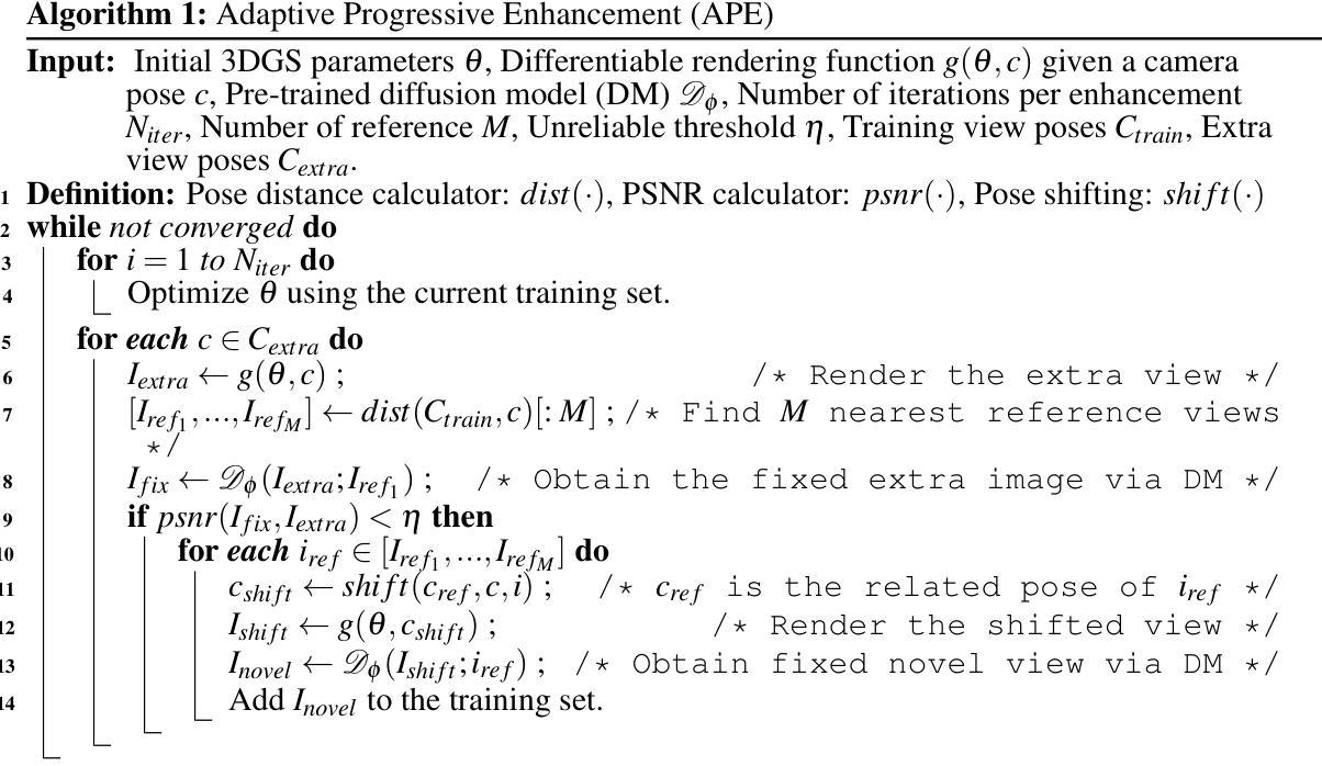 - 该方法直接在3DGS模式下进行替代场景补全和编辑,避免二维跨模态的空间时间一致性问题。