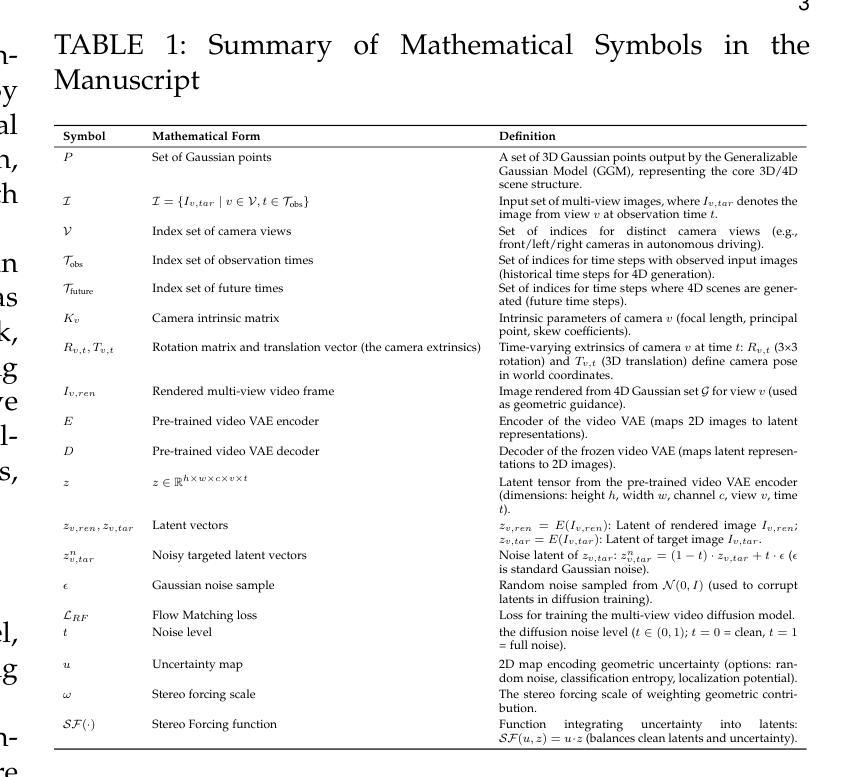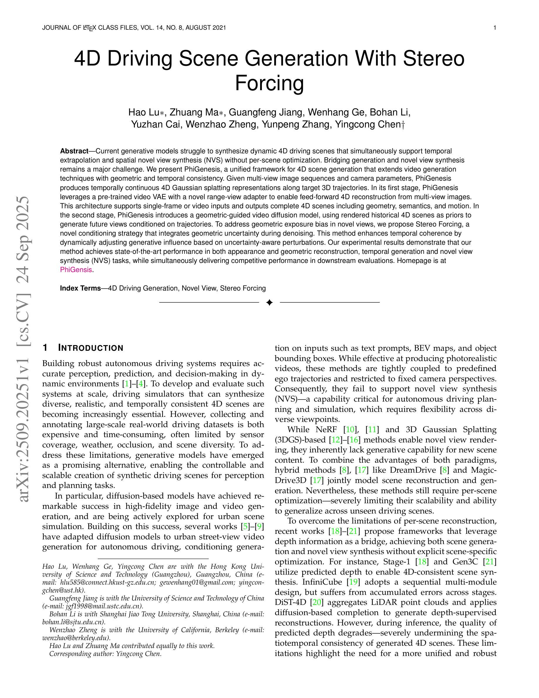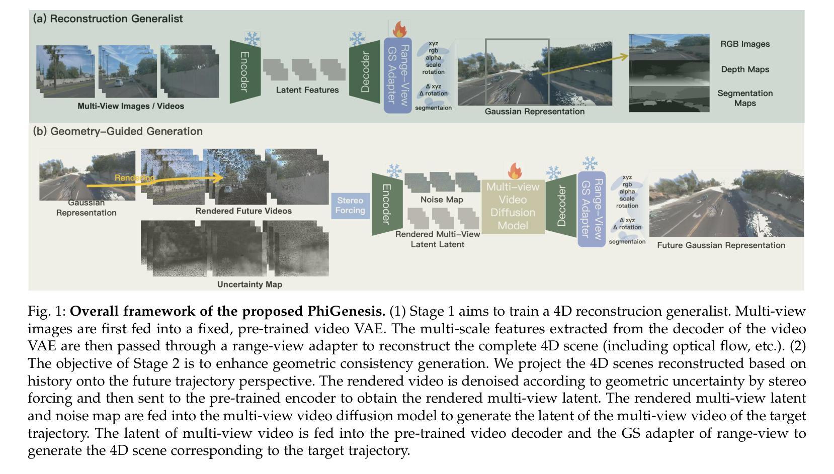 当前生成模型在合成动态四维驾驶场景方面面临挑战,这些场景需要同时支持时间外推和空间新颖视图合成(NVS),而无需针对每个场景进行优化。生成和新颖视图合成之间的桥梁仍然是一个主要挑战。我们提出了PhiGenesis,这是一个用于四维场景生成的统一框架,它结合了视频生成技术,实现了几何和时间一致性。给定多视图图像序列和相机参数,PhiGenesis可以沿着目标三维轨迹生成时间上连续的四维高斯溅射表示。在第一阶段,PhiGenesis利用预训练的视频VAE和新颖的范围视图适配器,实现从多视图图像的前馈四维重建。此架构支持单帧或视频输入,并输出完整的四维场景,包括几何、语义和运动。在第二阶段,PhiGenesis引入了一个受几何指导的视频扩散模型,使用渲染的历史四维场景作为先验来根据轨迹生成未来视图。为了解决新颖视图中的几何曝光偏差问题,我们提出了立体强制(Stereo Forcing)这一新颖的条件策略,它在去噪过程中整合了几何不确定性。这种方法通过根据不确定性感知扰动动态调整生成影响,增强了时间连贯性。我们的实验结果表明,我们的方法在外观和几何重建、时间生成和新颖视图合成(NVS)任务方面达到了最新性能水平,同时在下游评估中表现出竞争力。主页是PhiGenesis。