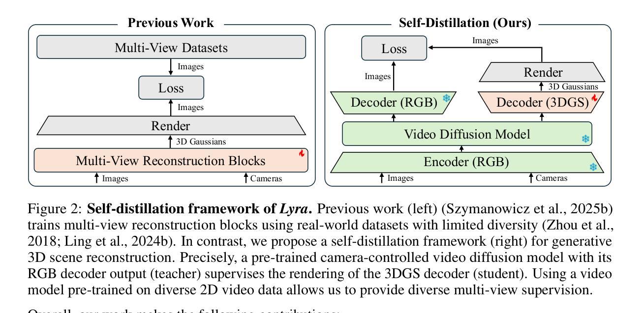 本文提出了一种基于自蒸馏技术的框架,能够将视频扩散模型中的隐性三维知识转化为显式三维高斯飞溅(3DGS)表示形式,从而实现无需多视角训练数据的三维场景生成。该框架通过增加一个三维高斯飞溅解码器来扩展传统的RGB解码器,使其可以从文本提示或单幅图像中合成三维场景,支持实时渲染和从单目输入视频中生成动态三维场景。实验结果表明,该框架在静态和动态三维场景生成方面达到了最新技术水平。