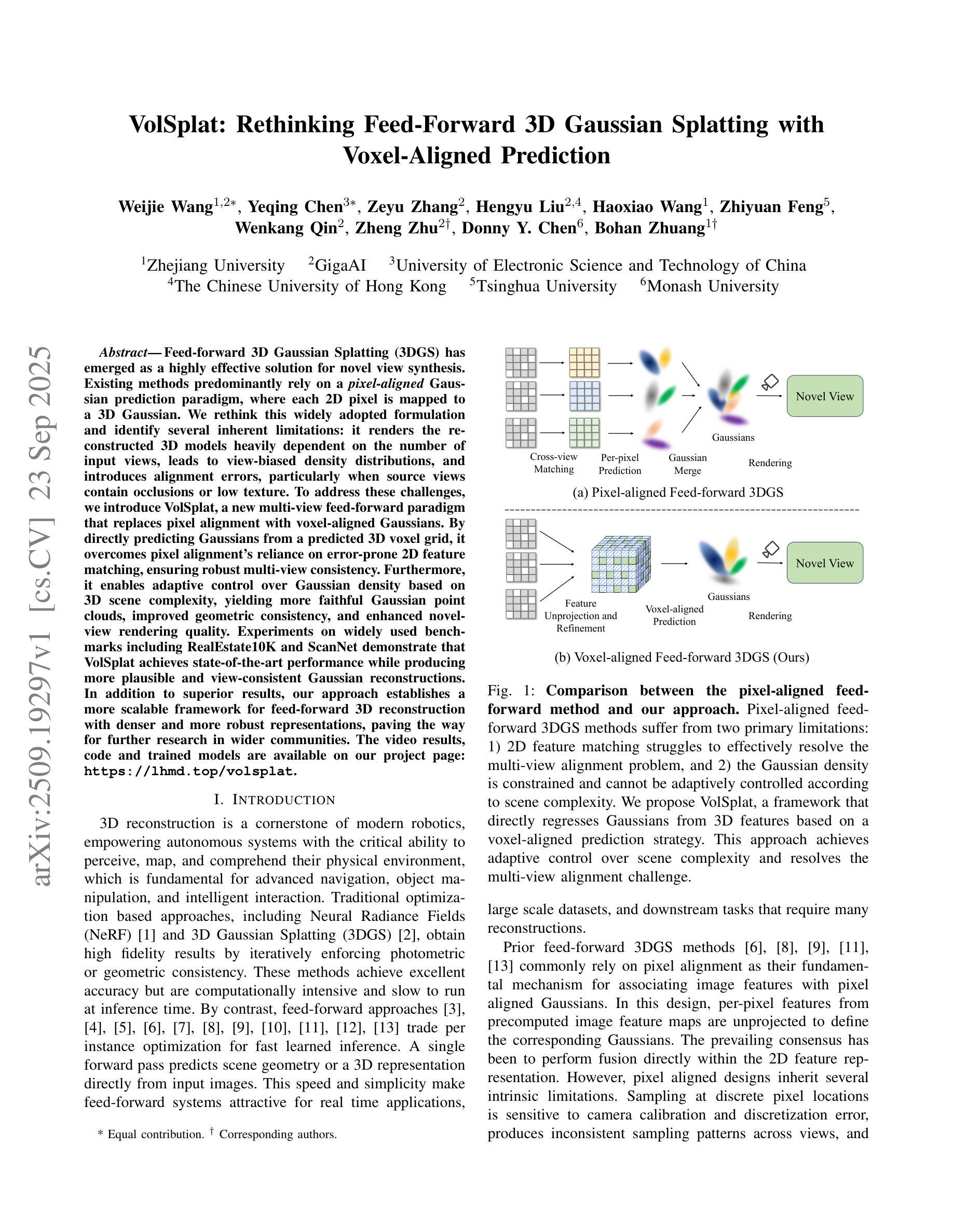 基于前馈的3D高斯点云(3DGS)已成为有效的视点合成解决方案。现有方法主要依赖像素对齐的高斯预测模式,存在依赖输入视角数量、视角密度分布偏差及对齐误差等问题。我们提出VolSplat,采用体素对齐高斯的新范式,预测三维体素网格上的高斯分布,克服像素对齐的缺陷,实现多视角一致性。此外,它可根据三维场景的复杂性自适应控制高斯密度,提高几何一致性及新视角渲染质量。在广泛使用的基准测试中表现卓越,实现更逼真、视角一致的高斯重建。同时建立可扩展的框架,为进一步的点云重建研究铺平道路。