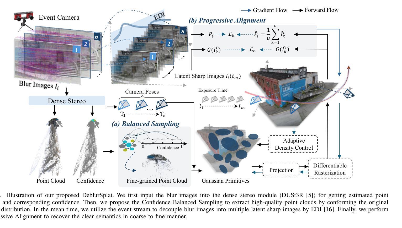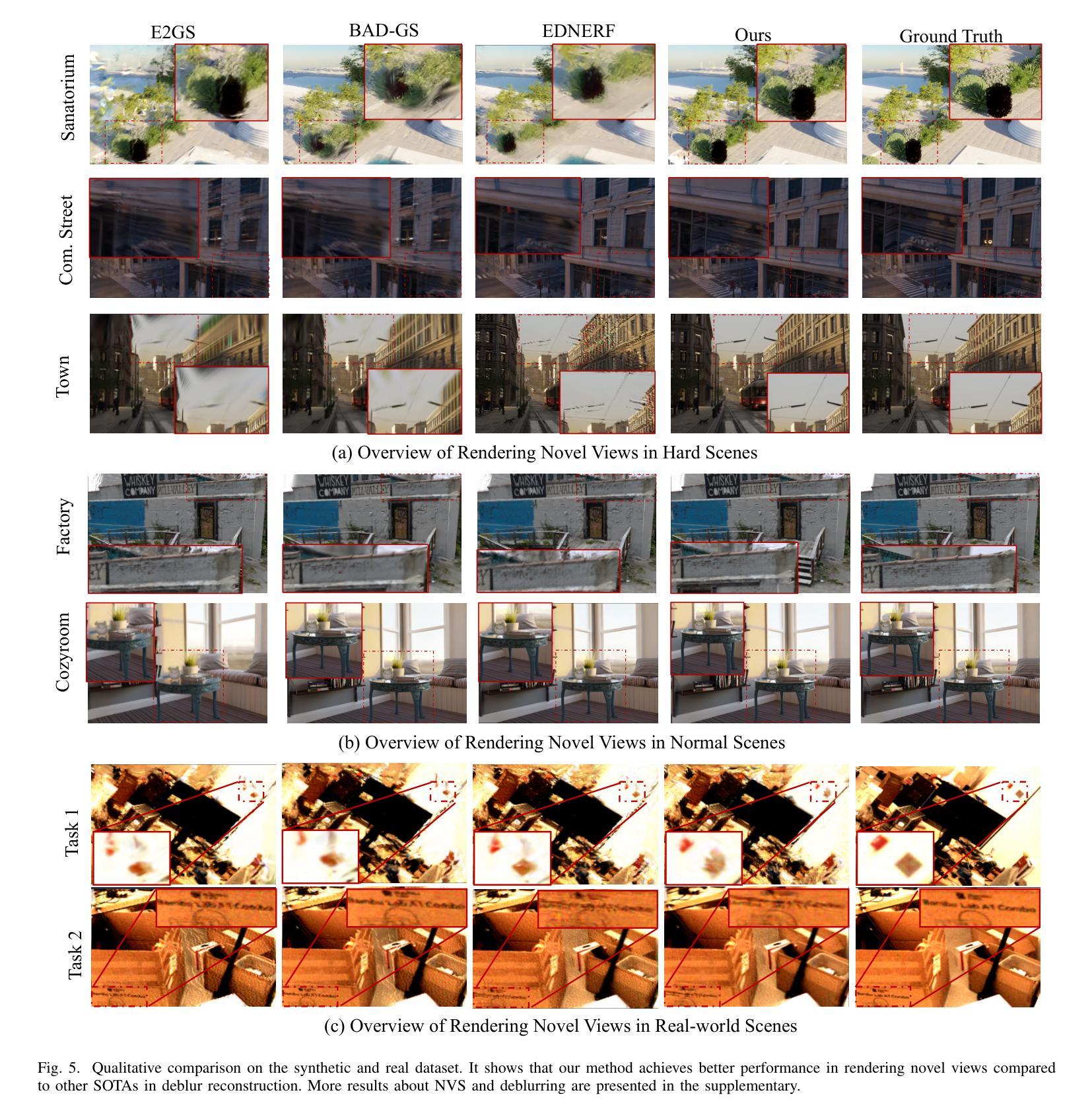 - 为解决快速运动区域的模糊问题,引入事件引导的损失函数,通过匹配连续渲染的亮度变化与事件流实现。